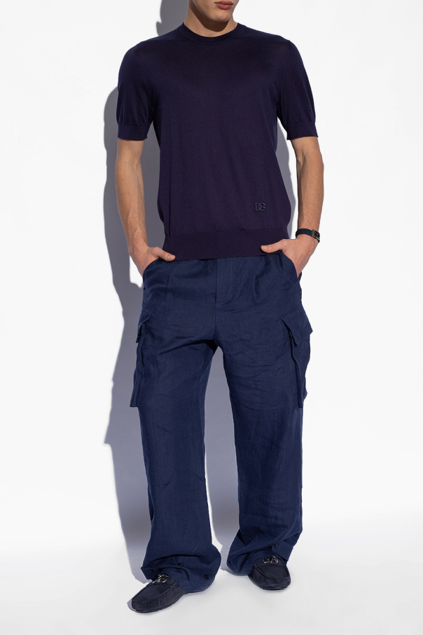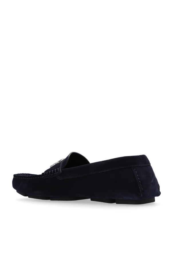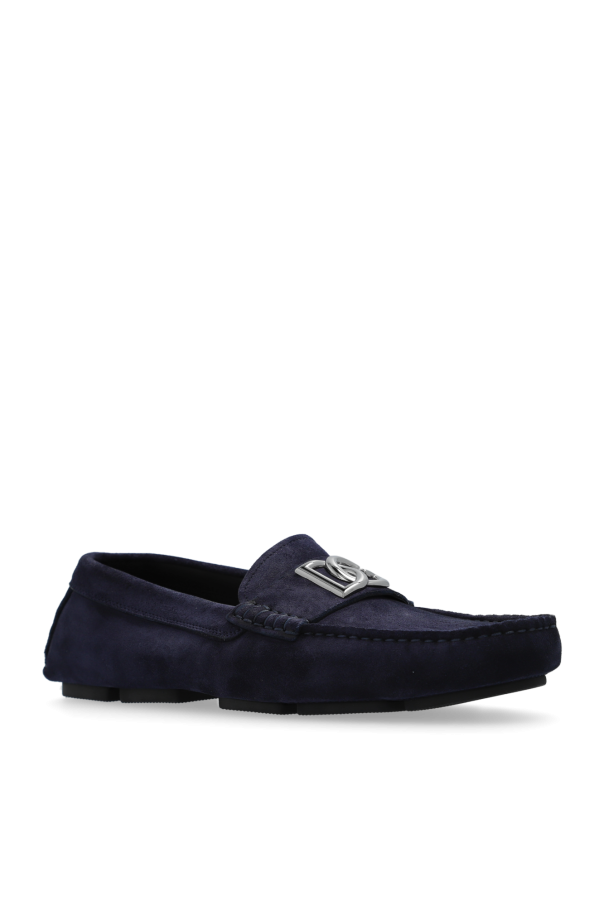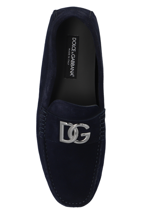 Navy moccasins from Dolce & Gabbana. Made of suede, this pair sits on a navy suede sole with black rubber trims and is decorated with a metal logo detail in dark silver-tone.