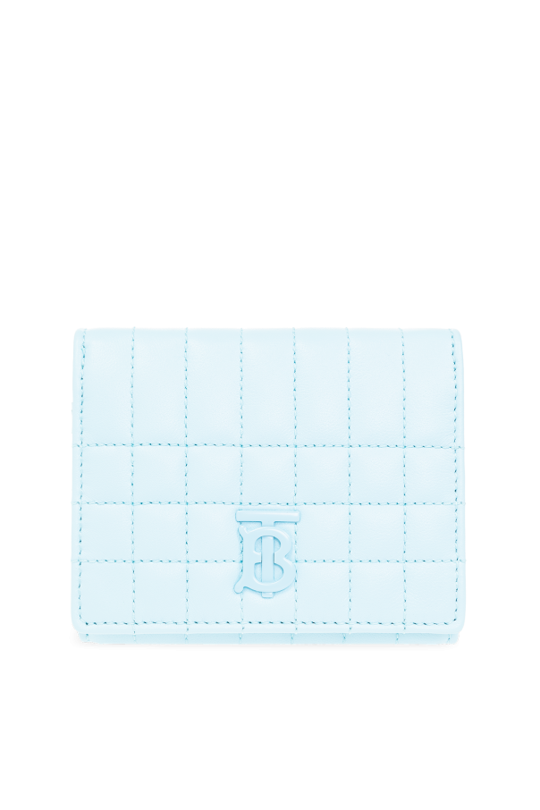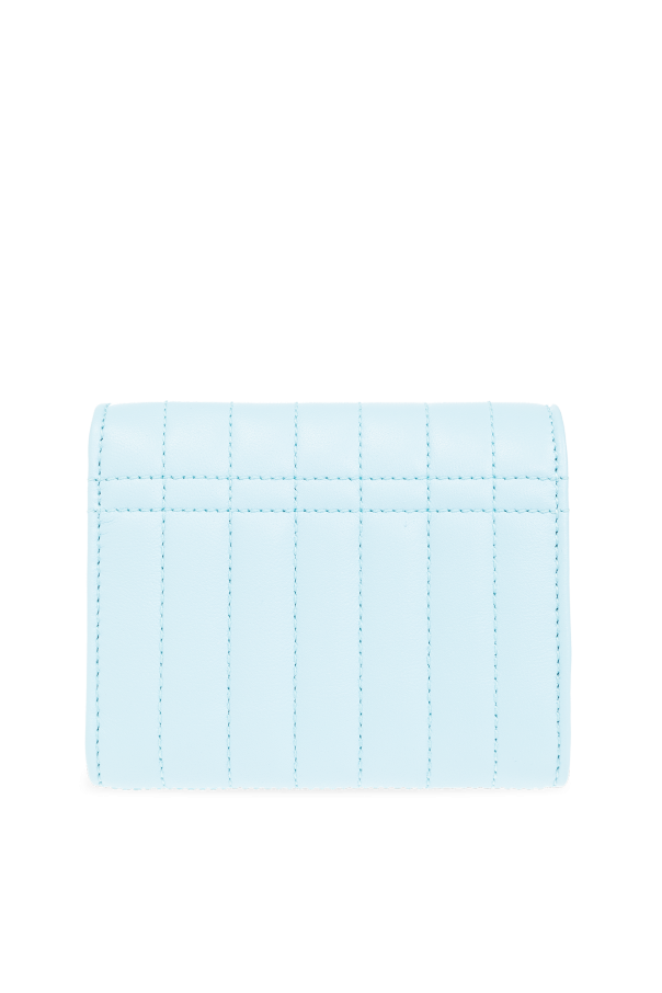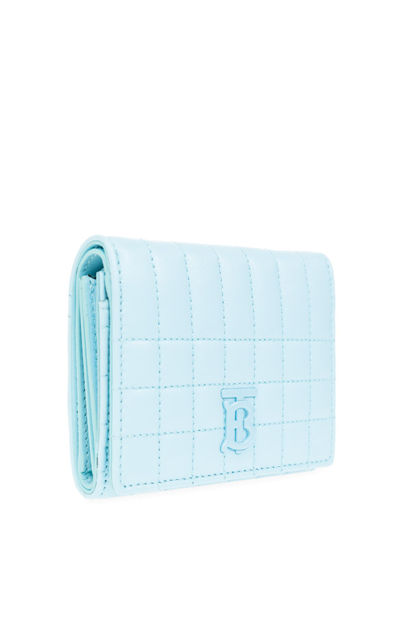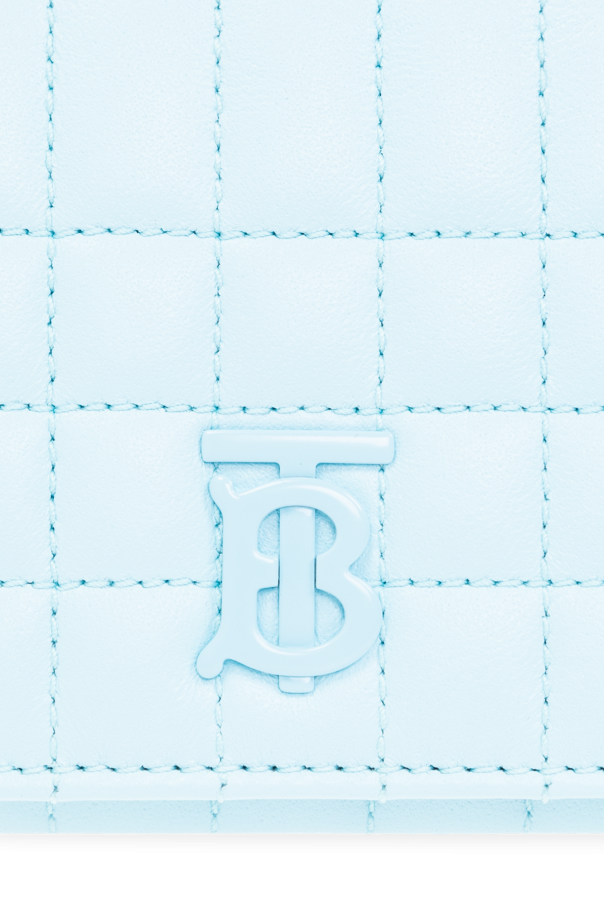 Light blue quilted wallet from Burberry. Crafted from lamb leather, this item fastens with a snap and is decorated with a logo detail. It has one bill compartment, one zipped coin pocket, four slip pockets and six card slots inside.