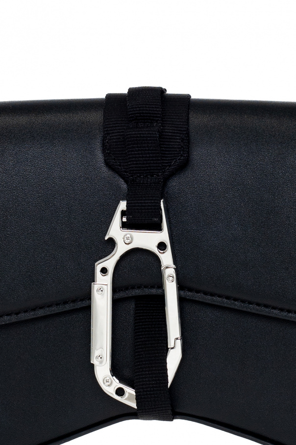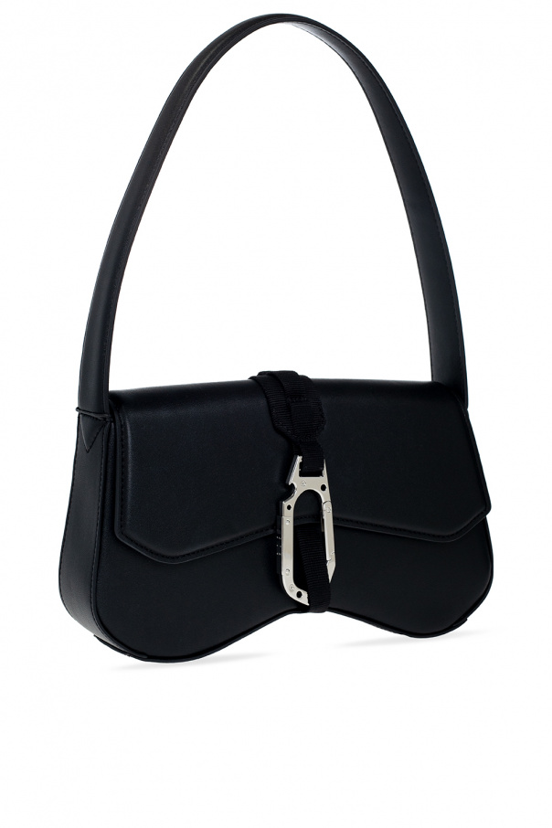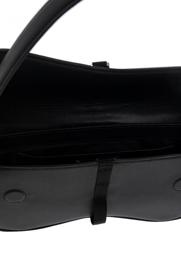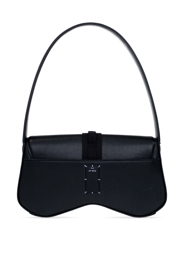 Black shoulder bag from No. 0 by McQ. Made of recycled leather, this model features a magnetic and snap hood closure, half-round handle, back slip pocket, silver-tone metal hardware and one internal compartment with one slip pocket.