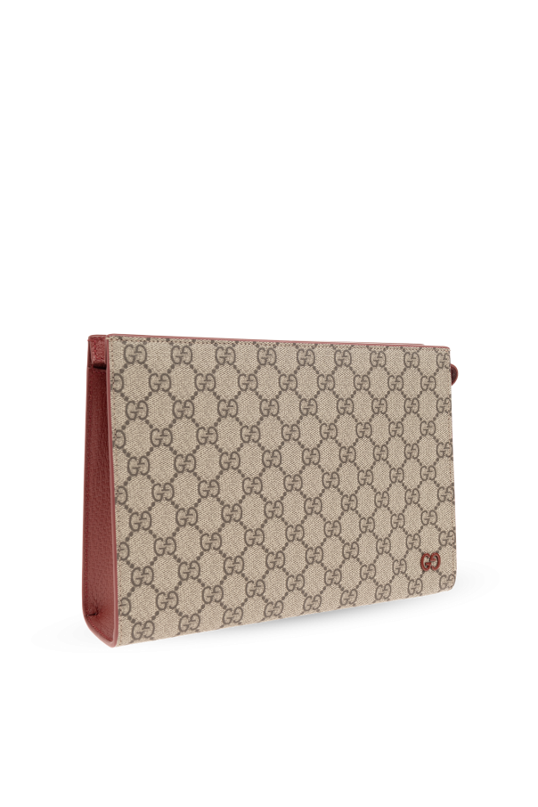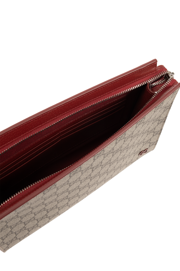 Beige and brown handbag from Gucci. Made of the brand\'s signature ‘GG Supreme’ canvas and trimmed with dark red calf leather, this design fastens via a zip and showcases a logo-shaped application on the front, a detachable wrist strap, silver-tone metal elements and one internal compartment with six card slots.