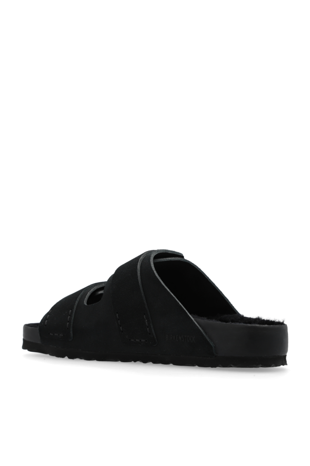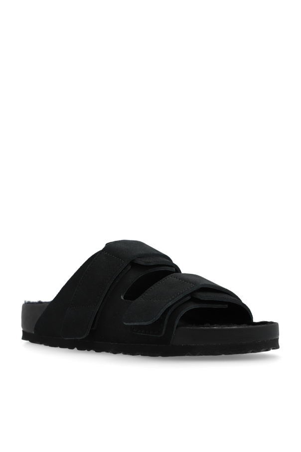Black ‘Uji Handstitch’ slides from Birkenstock x Tekla. Made of suede and lined with sheep fur, this model sits on a black EVA foam outsole and features an embossed logo, velcro closures and an anatomically shaped cork-latex footbed with standard width.