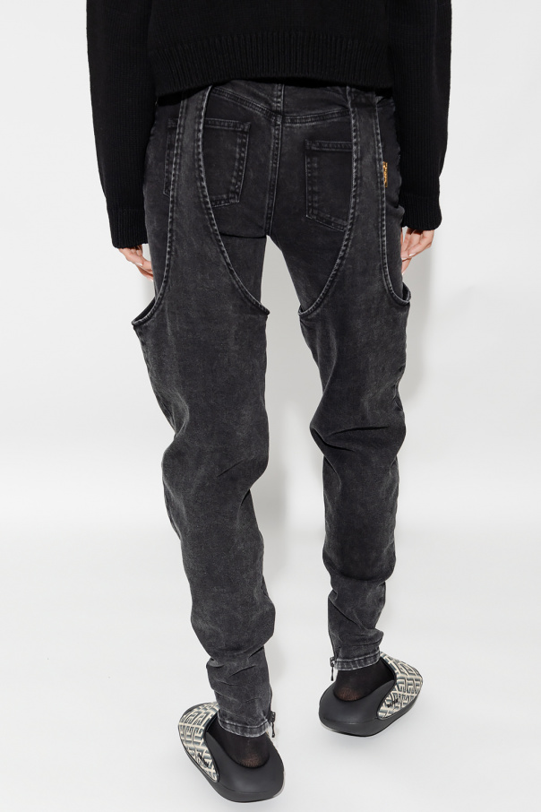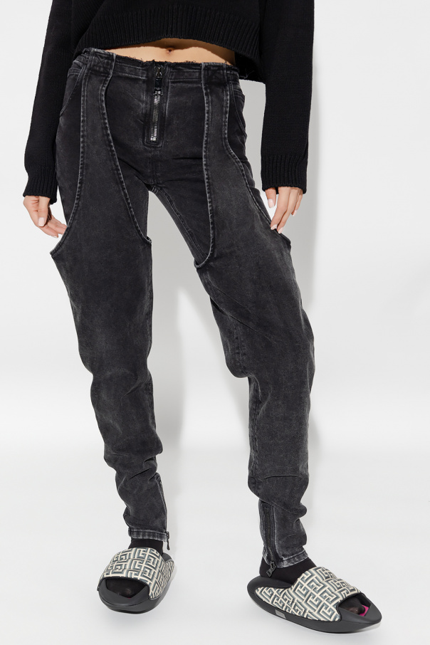 Black jeans from Balmain. Featuring decorative, two-layered legs that taper towards the ankles, this pair is complete with a zip fly, a raw hem, six slip pockets (four on the front and two at the back), zip cuffs and gold-tone logo hardware with an engraved logo at the back.