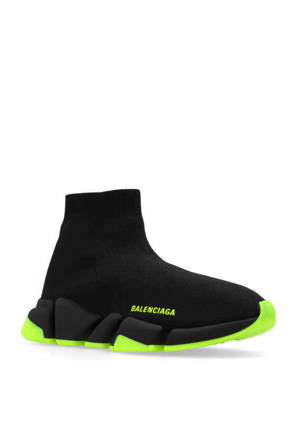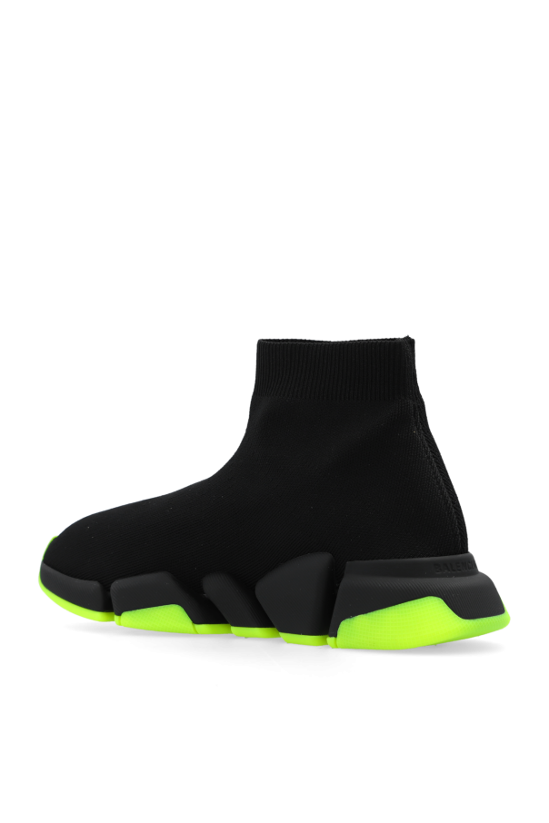 Black ‘Speed 2.0 Graffiti’ high-top sneakers with a sock from Balenciaga. Made of recycled material with a slip-on silhouette, this model sits on a neon yellow rubber sole with No Memory technology and showcases a printed logo.