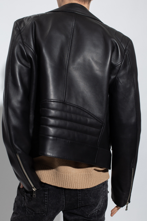 Black jacket from Balmain. Made of lamb leather, this style features a zip fastening, notch lapels, three zipped pockets and long sleeves.