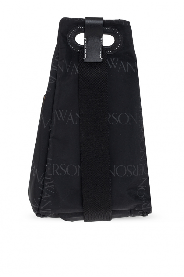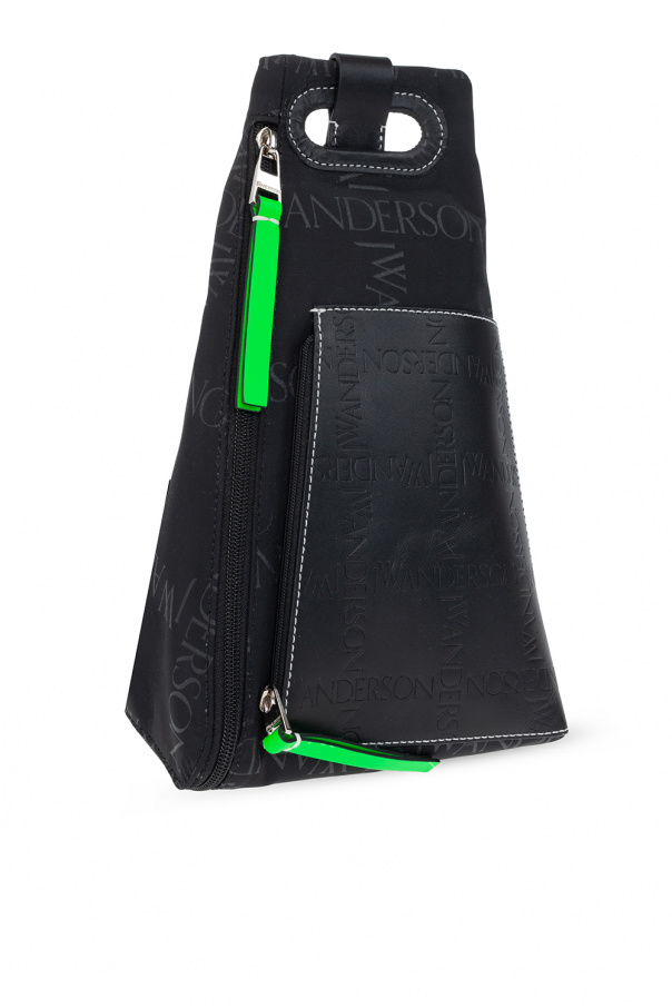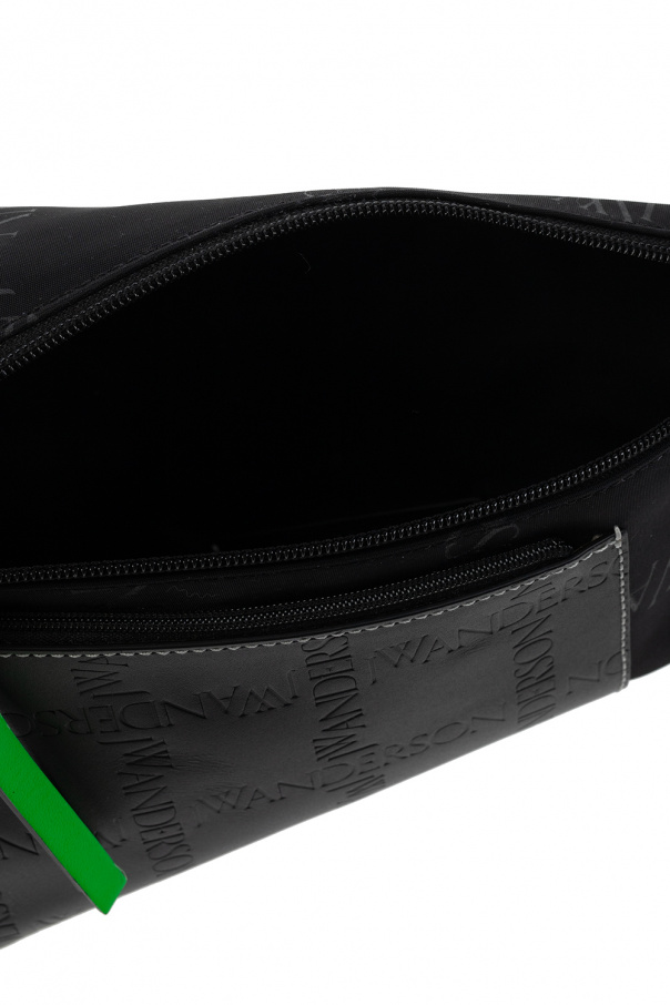 Black belt bag from JW Anderson. Crafted from nylon and trimmed with leather, this design features a zip fastening, a logo pattern, a zip pocket on the front, green inserts, an adjustable strap and one internal compartment.