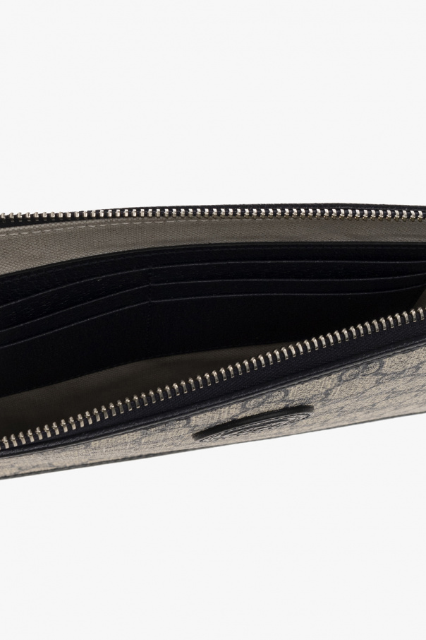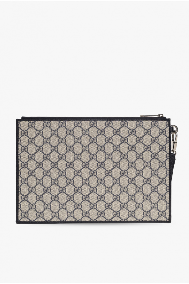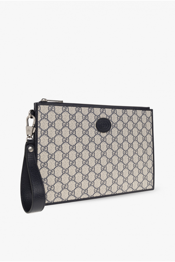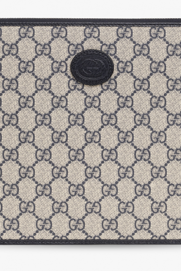 Beige and navy handbag from Gucci. Made of GG Supreme canvas with leather trims, this item features a zip fastening, logo patch, detachable wrist strap on the side, gold-tone metal hardware and one internal compartment with one slip pocket and six card slots.