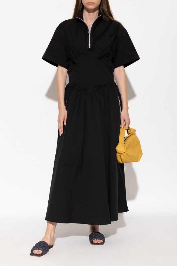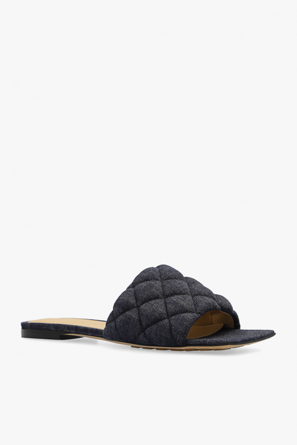Navy blue ‘Padded’ slides from Bottega Veneta. Crafted from fabric and leather, this model features a square toe, open toes and heel and a beige and black leather sole with anti-skid rubber elements for increased stability.