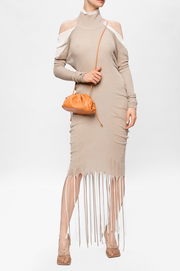 Beige ‘Stretch’ pumps from Bottega Veneta. Crafted from semi-sheer mesh with leather trims, this design has detachable gold-tone chain detailing and beige sole made of leather and rubber.