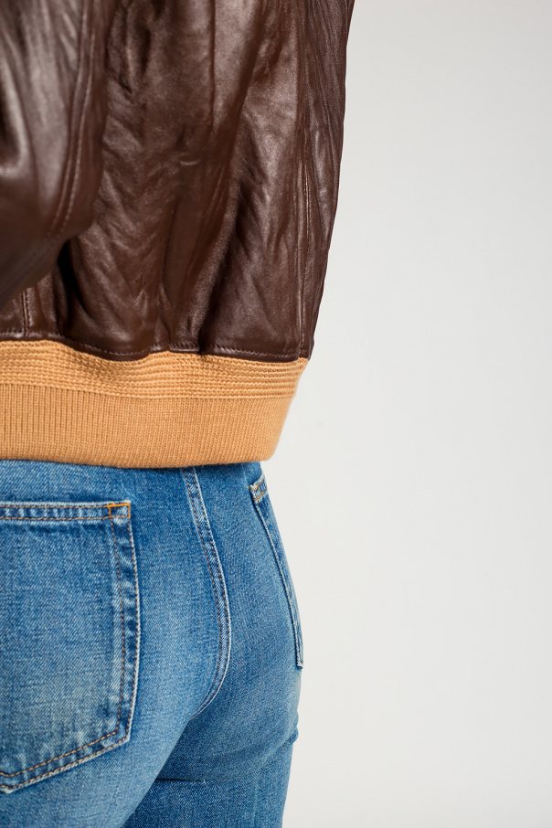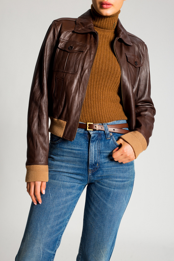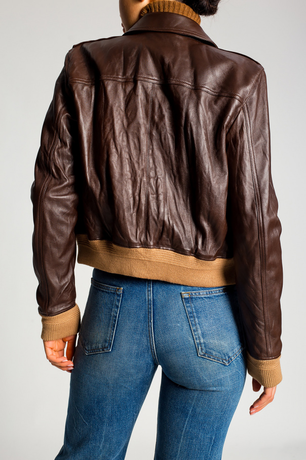 Brown jacket from Saint Laurent. Made of leather, this design features a zip fastening, two slip pockets, two buttoned flap pockets and ribbed trims in beige at the hem and cuffs.