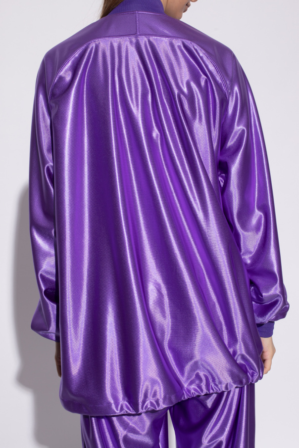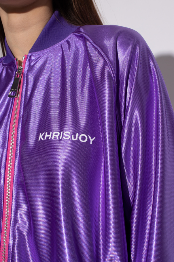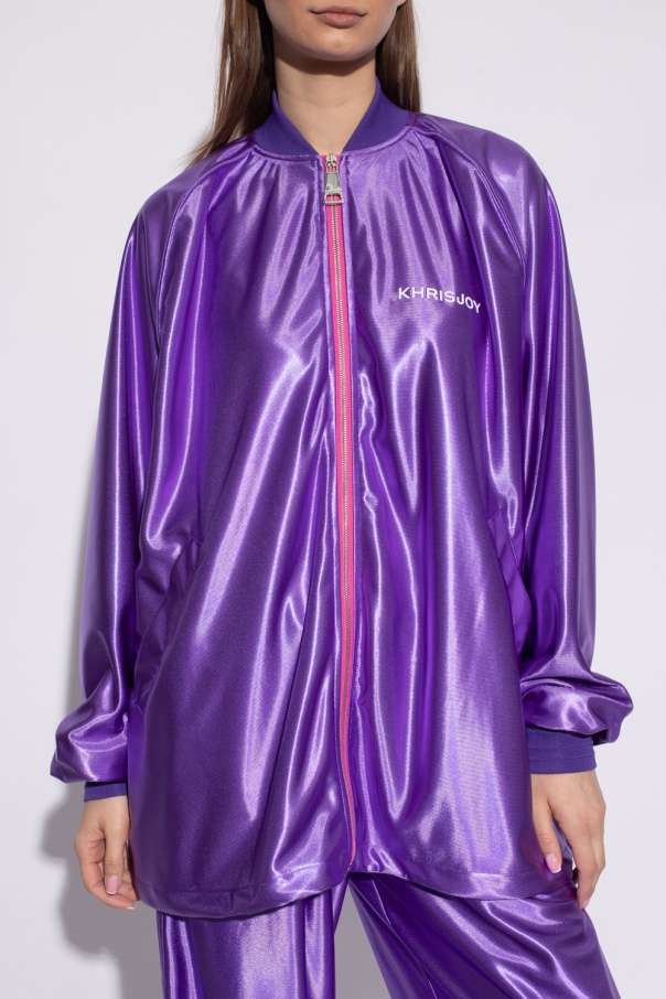 Sweatshirt in purple from Khrisjoy. Crafted from poly satin with an oversize silhouette, this style features a zip fastening, elasticized trims on the standing collar and bottom hem, a white graphic print with the brand\'s logo and a drawcord-adjustable hem.