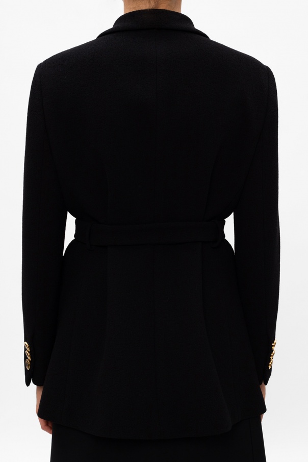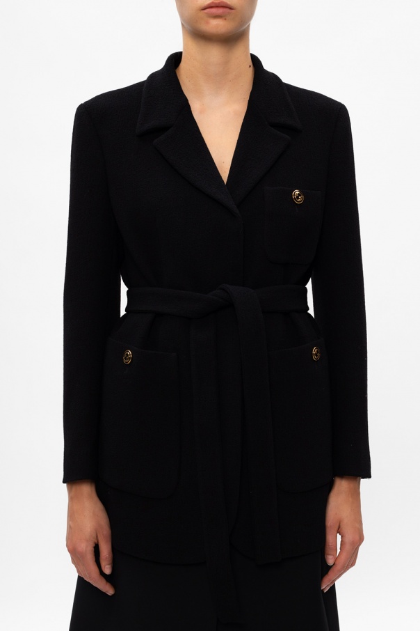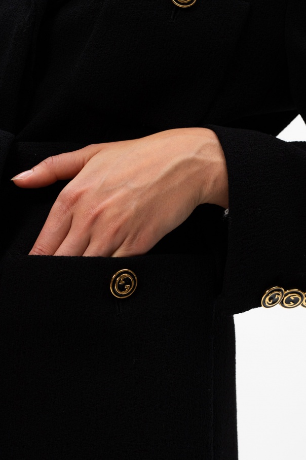 Black blazer with notched lapels from Gucci. Cut from wool, this piece comes with button fastening, three buttoned pockets and self-tie belt to accentuate the waist.