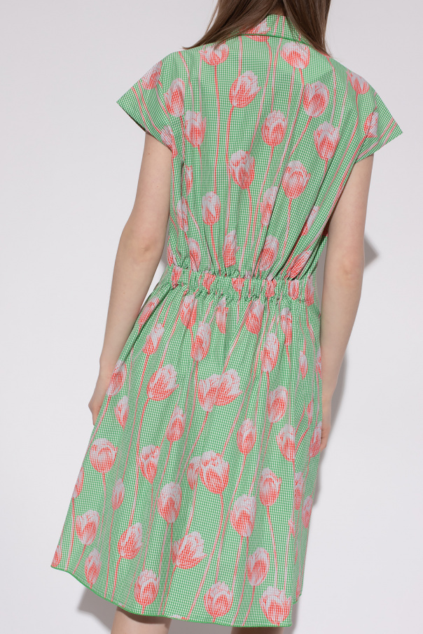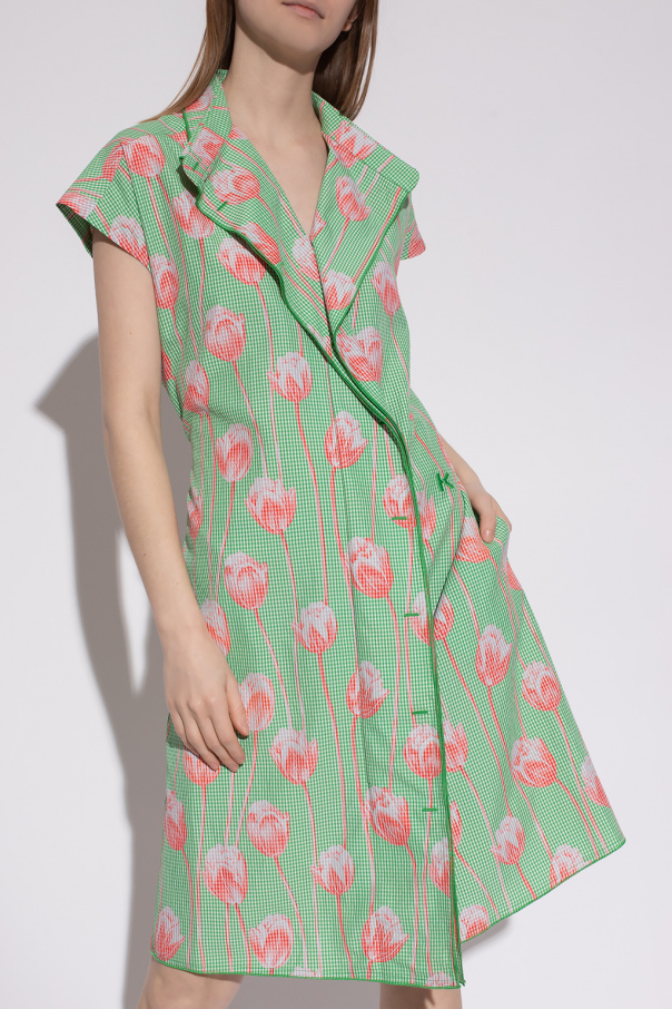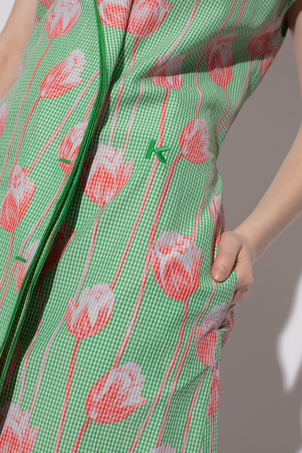 Green and white dress from Kenzo. Decorated with a check pattern and floral print in red and white, this design is complete with a V-neck with decorative trims, elasticated waist, short sleeves and side pockets.