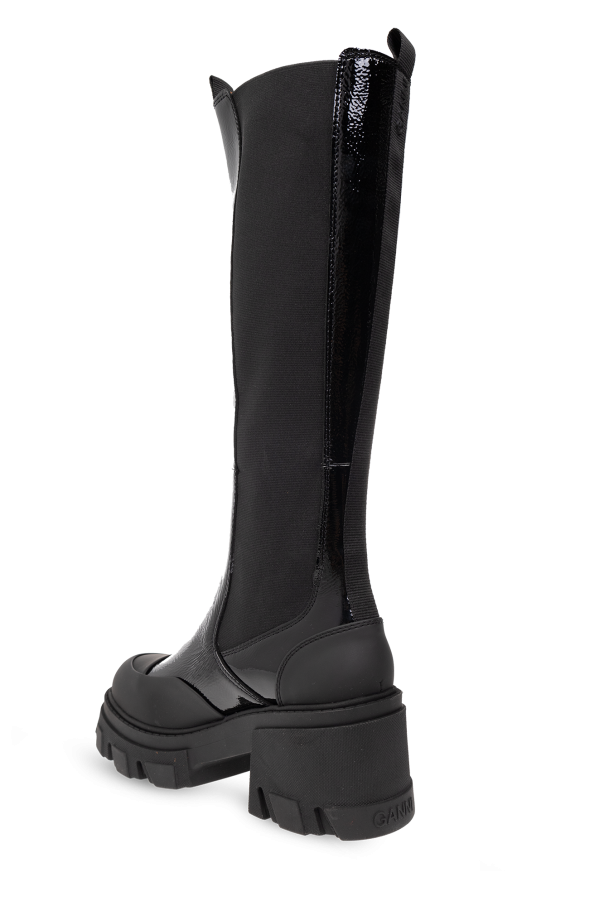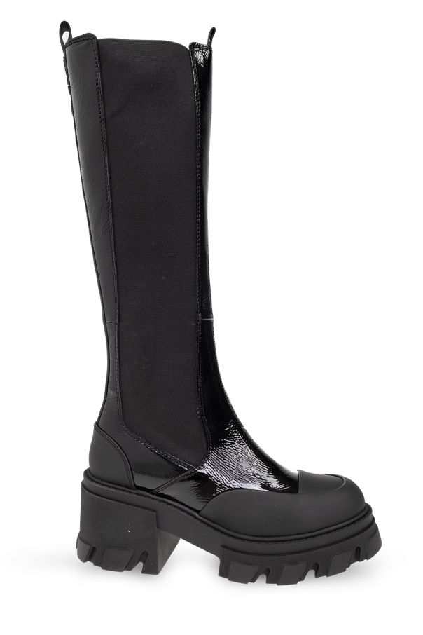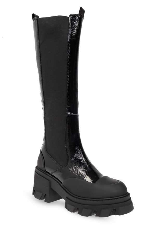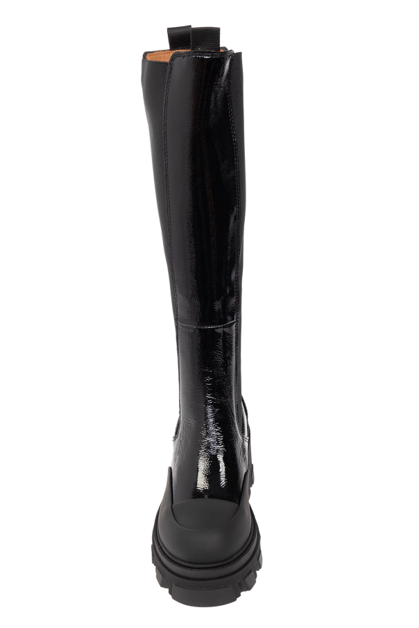 Black platform ankle boots from Ganni. Made of patent calf leather, this pair features elastic side panels, a black pull tab with a metal logo at the back and a black rubber sole.