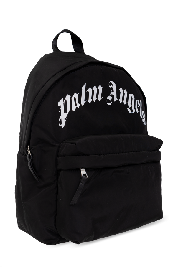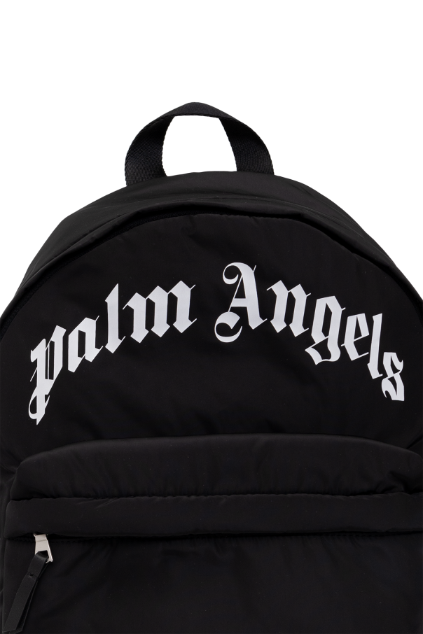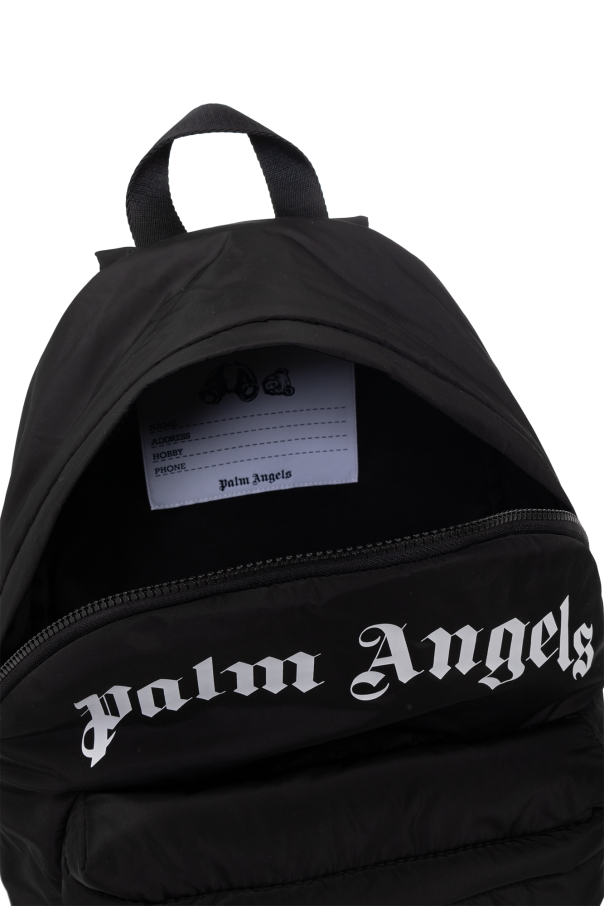 Black backpack from Palm Angels Kids. Made of fabric, this design features a zip fastening, printed white logo, zip pocket on the front, black trims, half-round handle, adjustable shoulder straps and one internal compartment.