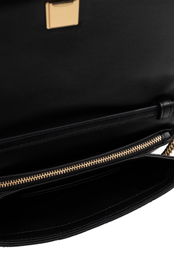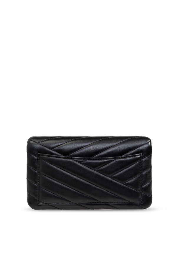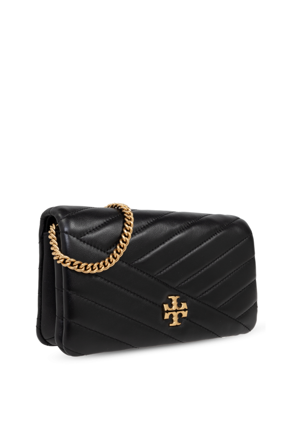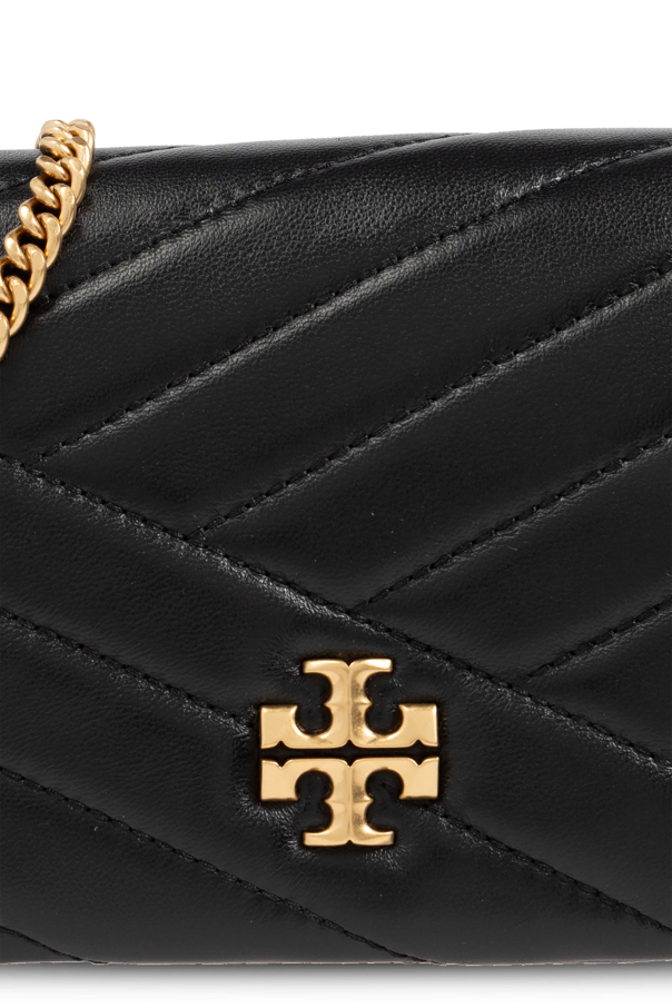 Introducing the Kira Chain Wallet from the exclusive collection by Tory Burch, a quintessence of sophistication and functional elegance. Crafted with meticulous precision, this rectangular, quilted masterpiece features diagonal lines that converge to form a visually striking pattern. The wallet\'s exterior, made of 100% smooth leather, boasts a sleek black hue, complemented by a gold designer logo that imbues it with an air of exclusivity. The Kira\'s allure is further magnified by its thick, gold chain strap, offering a striking contrast against the wallet\'s dark facade and elevating its elegant design. Its interior does not shy away from functionality; equipped with compartments, a zippered pocket, two card slots, and a magnetic snap closure, the Kira wallet is as practical as it is stylish. Whether draped over the shoulder or worn as a statement piece, the Kira Chain Wallet seamlessly integrates into any fashion-forward wardrobe, promising to enhance one\'s ensemble with its refined aesthetic and practicality. Why Purchase this Product? Exquisite craftsmanship featuring 100% genuine leather for durability and elegance. Practical design with two compartments, a zippered pocket, and card slots for organizational ease. Gold-tone hardware, including a logo and chain strap, adds a luxurious touch to any outfit. Designed by Tory Burch, a testament to high-quality and fashionable sophistication.