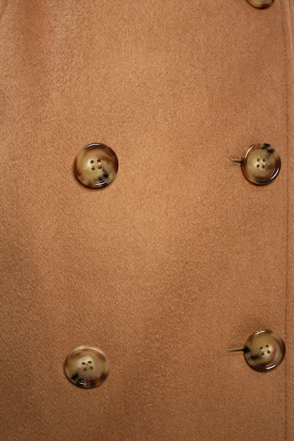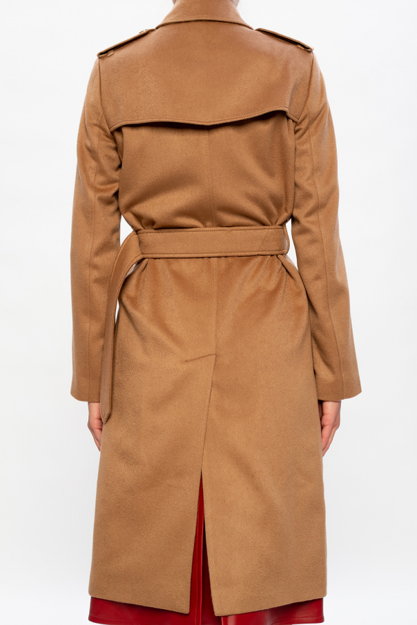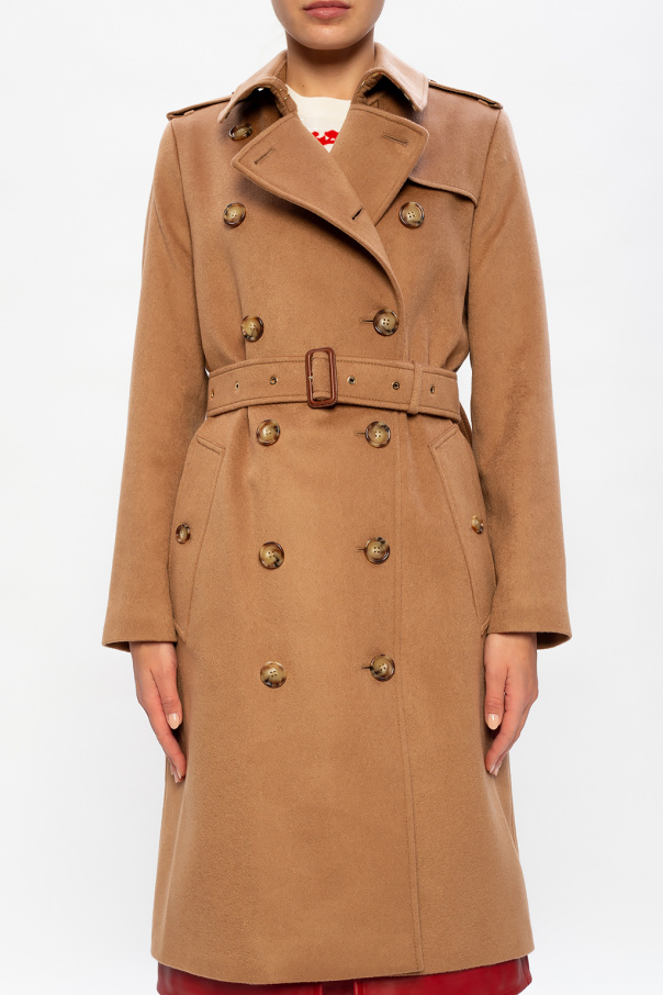 Brown collared coat from Burberry. Crafted from cashmere, this piece of outerwear employs button fastening, buckle belt at the waist, two buttoned pockets on the front and single vent on the back.