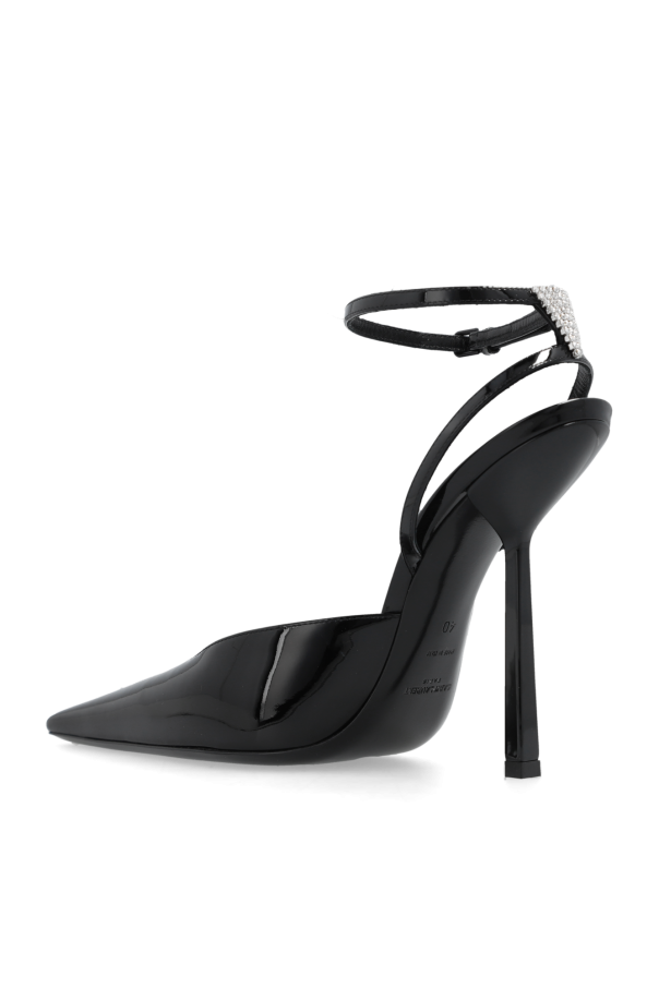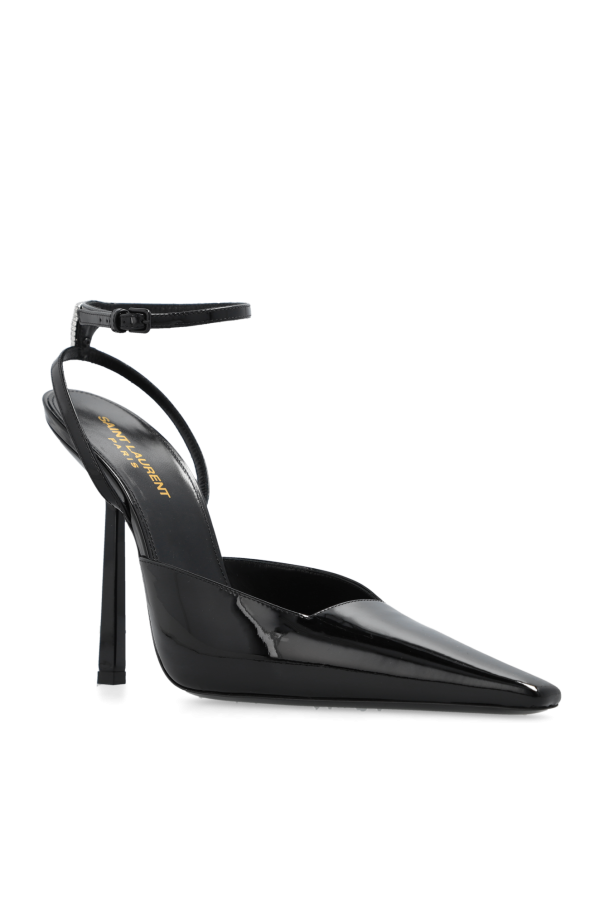Black ‘Anouk’ pumps from Saint Laurent. Made of patent leather with an elongated, square toe, this model sits on a black leather sole and features an adjustable ankle strap and a rhinestone-bejewelled appliqué on the back.