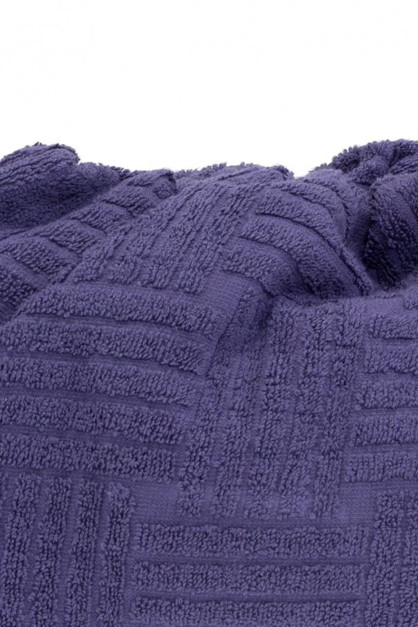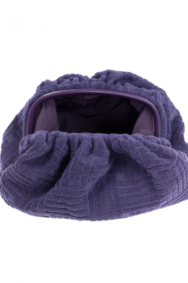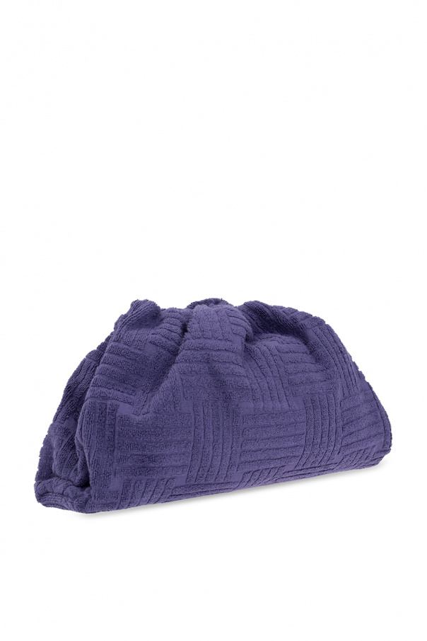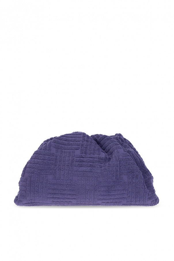 Purple ‘The Pouch' clutch from Bottega Veneta. Crafted in terry cloth with an all-over pattern, this item features a magnetic snap fastening and one internal compartment.