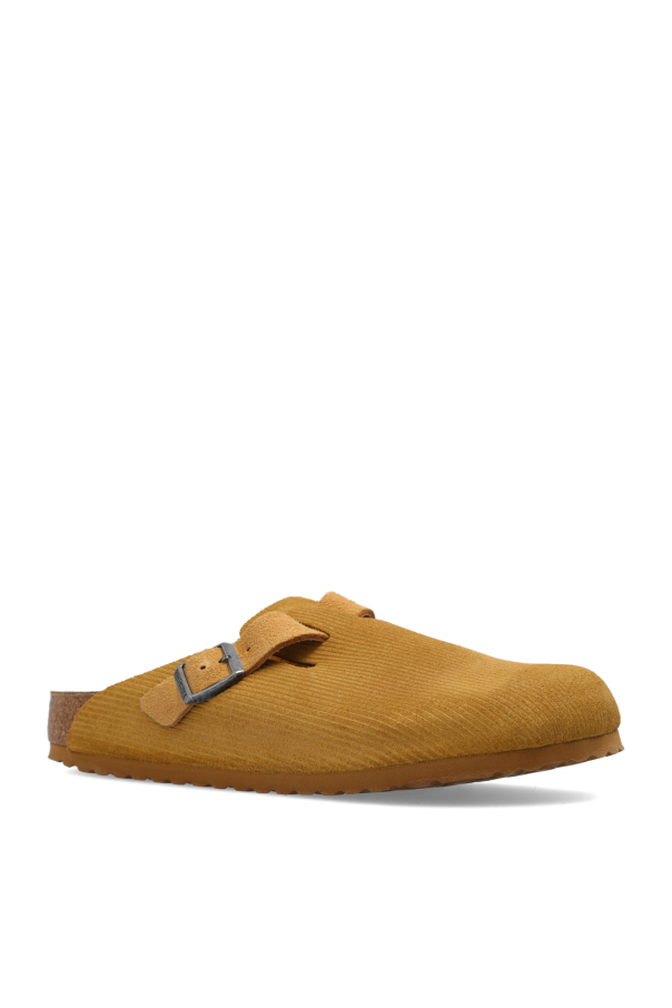 Light brown \'Boston BS\' slides from Birkenstock. Crafted from ribbed suede, this model sits on a brown sole in EVA foam and natural cork and features a front strap with a logo-embossed buckle. Narrow width.
