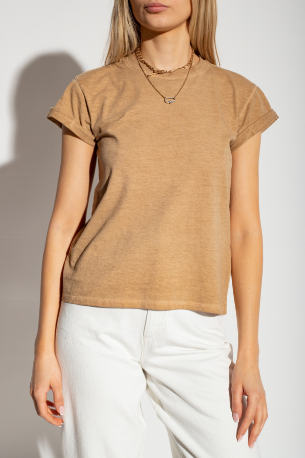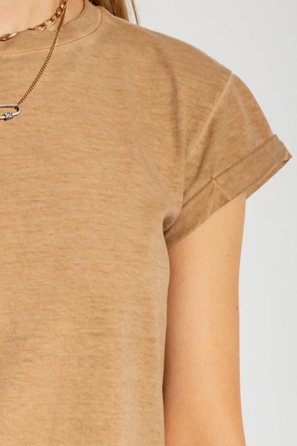 Brownish beige ‘Anna’ crewneck T-shirt from AllSaints. Made of cotton, this style features short sleeves, an elasticated collar and a dark grey graphic print with the brand\'s logo at the back.