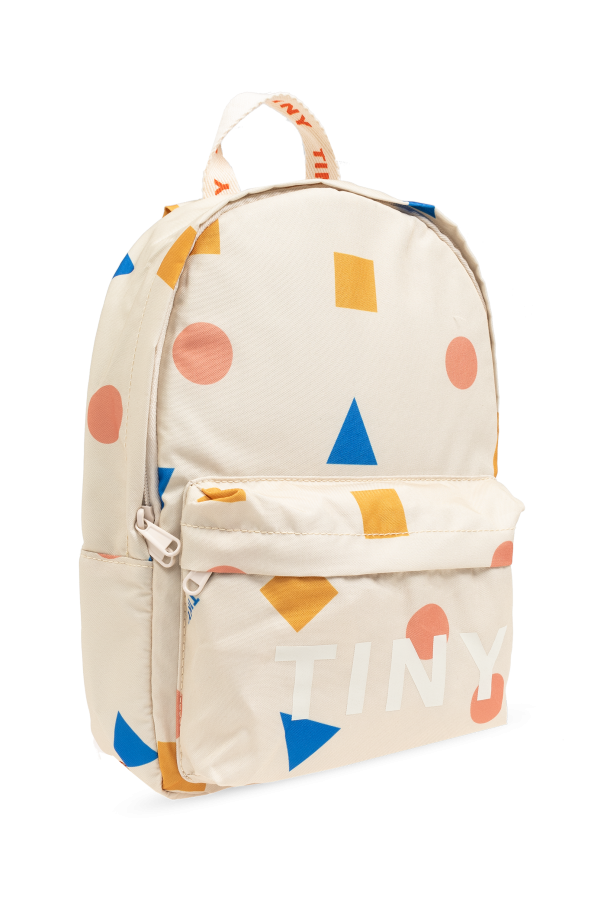 Introducing the Geometric Print Backpack from the exclusive Tiny Cottons collection. Designed for children with an eye for style and functionality, this backpack is a perfect blend of playful aesthetics and practical design. Crafted in a classic rectangular shape with rounded corners, this exquisite backpack features a main compartment secured with a double zipper and a front pocket also fastened with a zipper. The geometric print in vibrant hues of blue, orange, and yellow against a creamy background adds a touch of whimsy and charm. Made from durable, easy-to-clean polyester, this backpack is both resilient and stylish, making it ideal for everyday use. The adjustable shoulder straps ensure a comfortable fit, while the hand-carry handle is adorned with the brand\'s logo, adding a distinctive flair. The front pocket proudly displays the word \"TINY\" in bold white letters, with the same branding subtly imprinted on the straps and handle in a striking orange shade. Inside, the simplistic design offers a spacious single compartment, perfect for books, snacks, and other essentials. Why Choose This Product? Exclusive design with colorful geometric prints. Durable and easy-to-clean polyester material. Spacious main compartment with a secure double zipper. Comfortable, adjustable shoulder straps. Stylish branding details on the front pocket and straps.