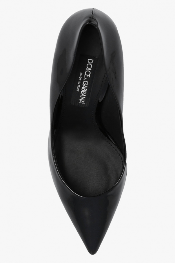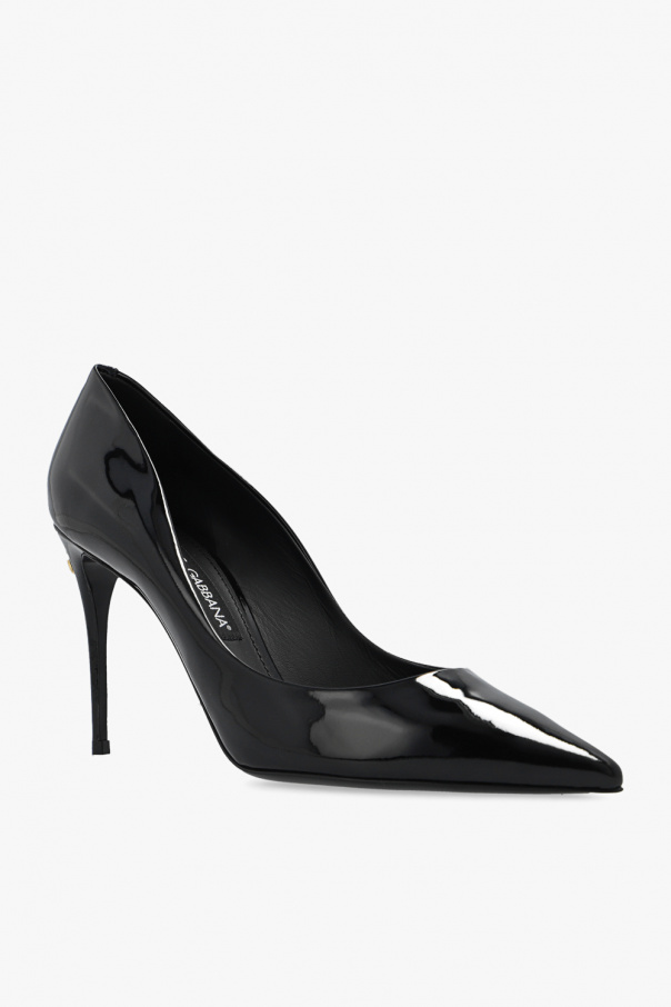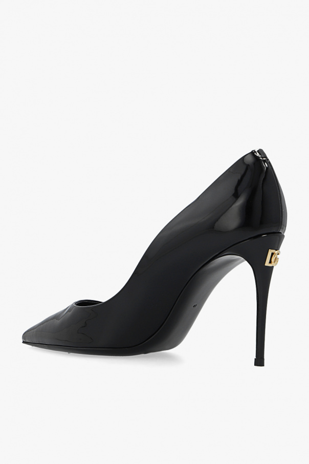 Black ‘Cardinale’ stiletto pumps from Dolce & Gabbana. Made of patent leather, this pointed toe pair features a gold-tone metal logo appliqué and black leather sole.