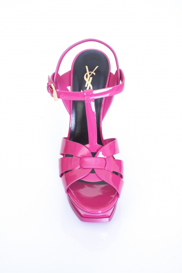 Pink \'Tribute\' Saint Laurent sandals with cross-over straps with a buckle fastening on the ankle. A black insole features a gold-tone logo.