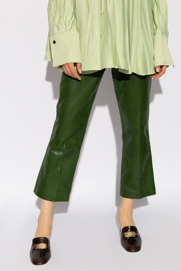 Introducing the epitome of sartorial elegance, the FERRAGAMO Green Leather Pants. Crafted with meticulous attention to detail, these pants are a testament to the legacy of high fashion and refinement. The dominant shade of green adds a touch of earthy sophistication, making these pants a versatile addition to any wardrobe. Constructed from 100% genuine lamb leather, the outer layer of these pants exudes an irresistible natural sheen, complemented by a 100% cotton interior for ultimate comfort. The classic cut, with straight legs that taper gently, embodies timeless style while ensuring a flattering fit. Functional features such as belt loops, a button closure, and meticulously crafted pockets enhance practicality without sacrificing style. The visible, precise stitching accentuates the garment\'s exquisite craftsmanship, a hallmark of FERRAGAMO\'s renowned design ethos. Why Purchase This Product? Elevated Material Quality: Luxurious lamb leather paired with a cotton lining for comfort and durability. Timeless Design: The classic silhouette ensures these pants remain a staple in your collection for years to come. Functional Elegance: Practical details like pockets and belt loops merge utility with high fashion. Exquisite Craftsmanship: Precision stitching and careful construction reflect FERRAGAMO\'s commitment to excellence.