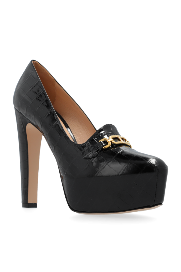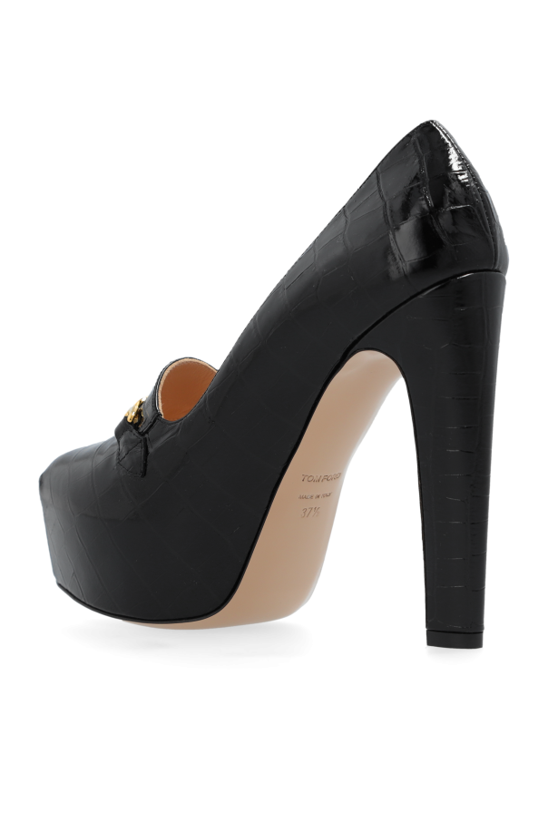 Experience the epitome of sophistication with these Leather High-Heel Pumps from the exclusive collection of Tom Ford. Designed with a classic silhouette featuring a rounded toe and a towering, robust platform heel, these shoes embody timeless elegance. Crafted from black, patent leather, the pumps boast a luxurious crocodile-embossed pattern, exuding opulence with every step. The striking gold chain adorning the front adds a touch of refinement, while the inner lining proudly displays the \"TOM FORD\" signature alongside \"Made in Italy\" – a testament to their impeccable craftsmanship. These pumps, with their sleek black finish and exquisite detailing, effortlessly combine traditional elegance with contemporary flair, making them the perfect choice for any special occasion. Why You Should Buy This Product? Exquisite crocodile-embossed pattern for a luxurious appearance. Crafted from high-quality patent leather for a lasting, elegant shine. Adorned with a gold chain detail for added sophistication. Signature \"TOM FORD\" and \"Made in Italy\" marking for authenticity and premium quality. Designed by the iconic Tom Ford, a renowned figure in the fashion industry.