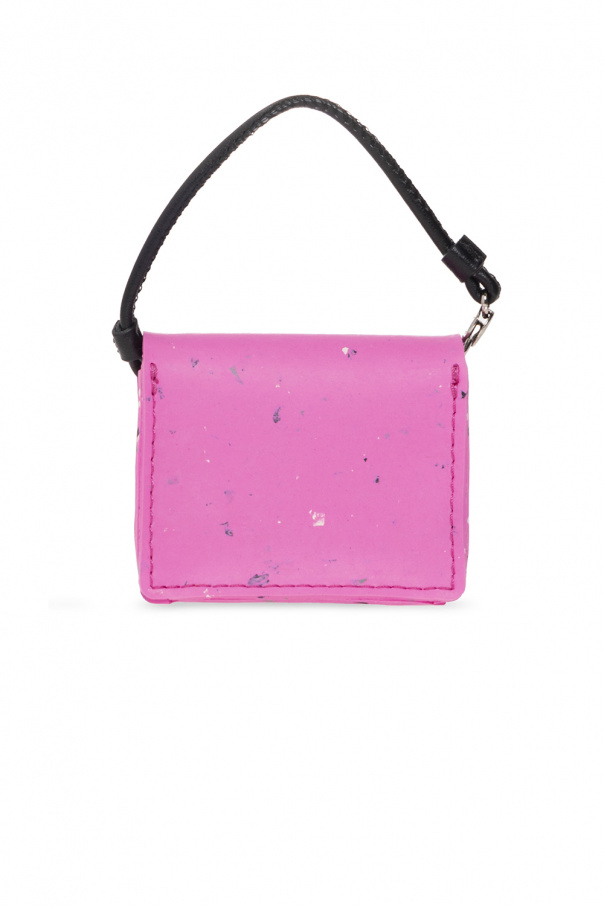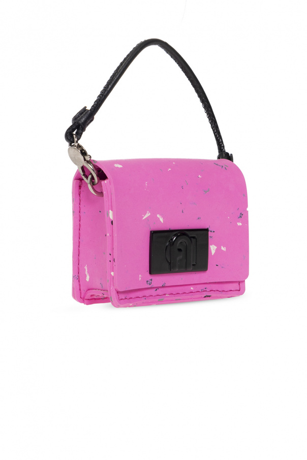 Pink AirPods case from Furla. Fastened with snaps, this pair features an elastic waistband, decorative trimming, metal logo appliqué in black and black leather strap with a snap hook on the side.
