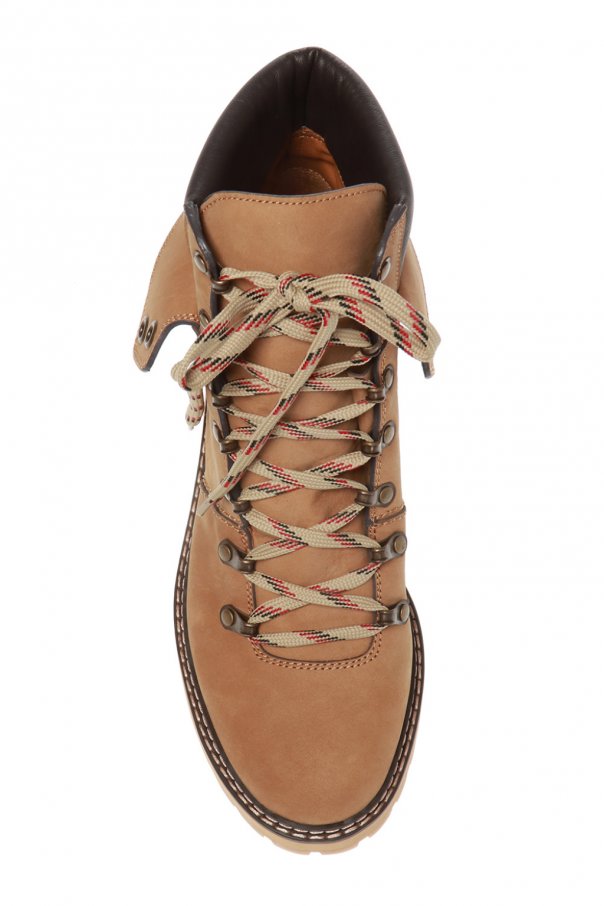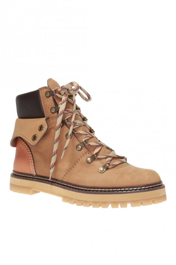 Beige and black ‘Eileen’ hiking boots from See By Chloé. Crafted from smooth leather overlays and suede, this lace-up pair is set on a beige rubber sole and showcases an embossed logo.