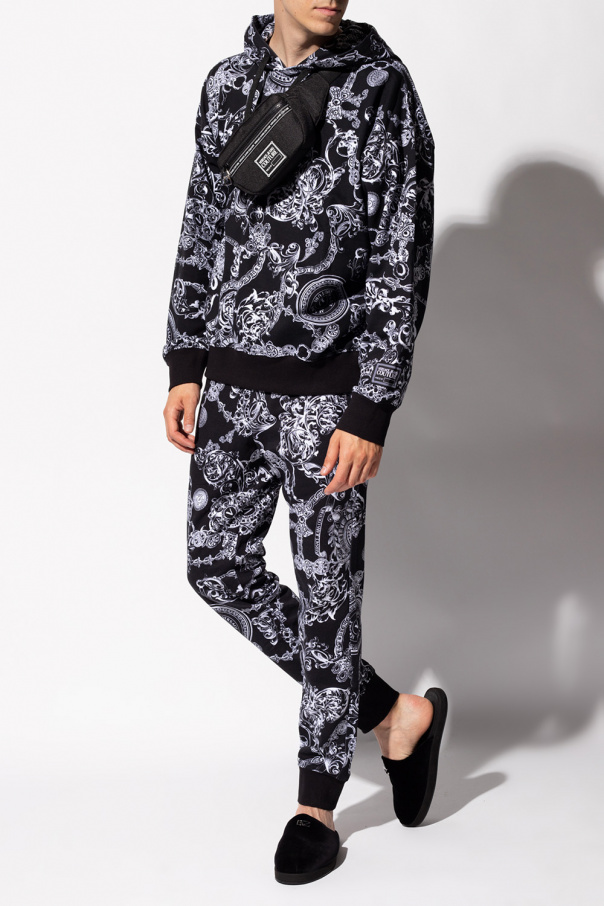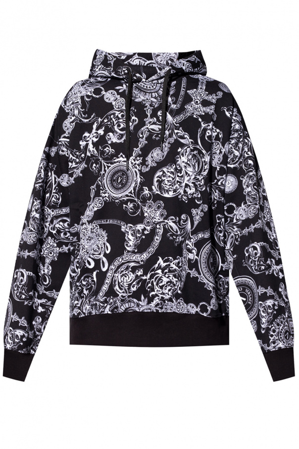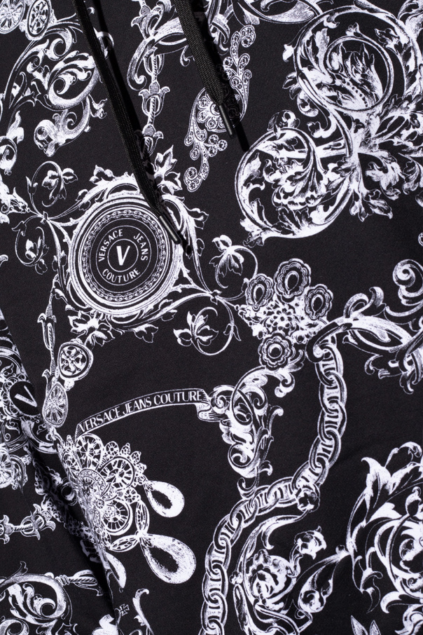 Black sweatshirt with a drawcord-adjustable hood from Versace Jeans Couture. Crafted from cotton jersey, this hoodie showcases ribbed trims on the edges and a white graphic print with the brand's logo.