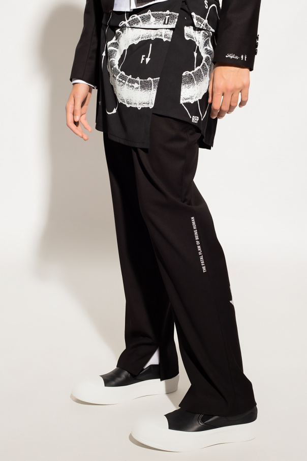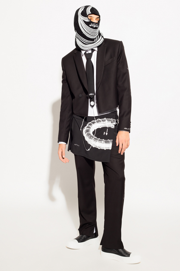 Black skirt from MSFTSrep. Fastened with buttons, this garment features a printed pattern, white logo and slits at the sides and hem.