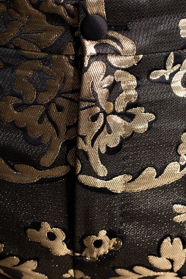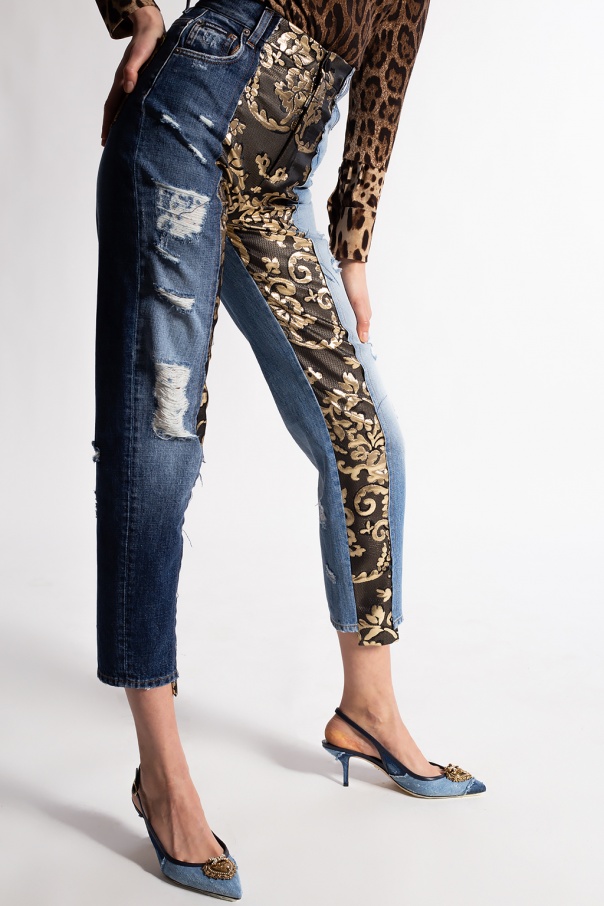 Blue high-waisted jeans from Dolce & Gabbana. Crafted from a stretchy cotton denim with a stonewashed treatment and an embroidered gold-tone pattern, this five-pocket design features a zip fly with a button, tapered legs and a logo appliqué on the back pocket.