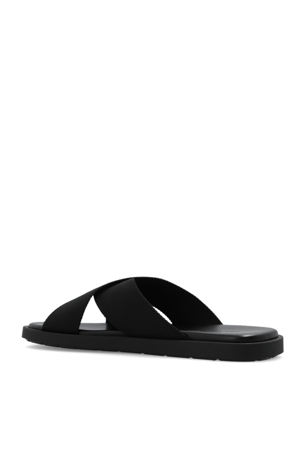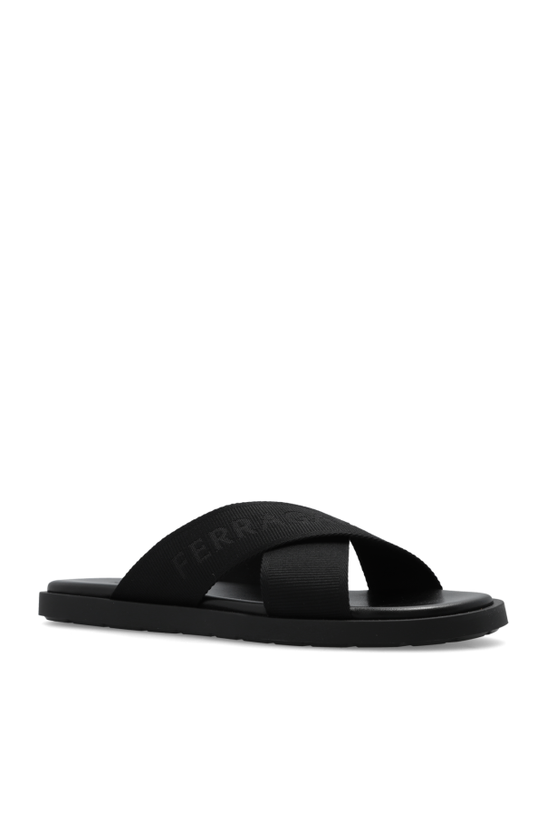 Black ‘Fenice’ slides from FERRAGAMO. Made of fabric, this model sits on a black rubber sole and showcases the brand\'s logo.