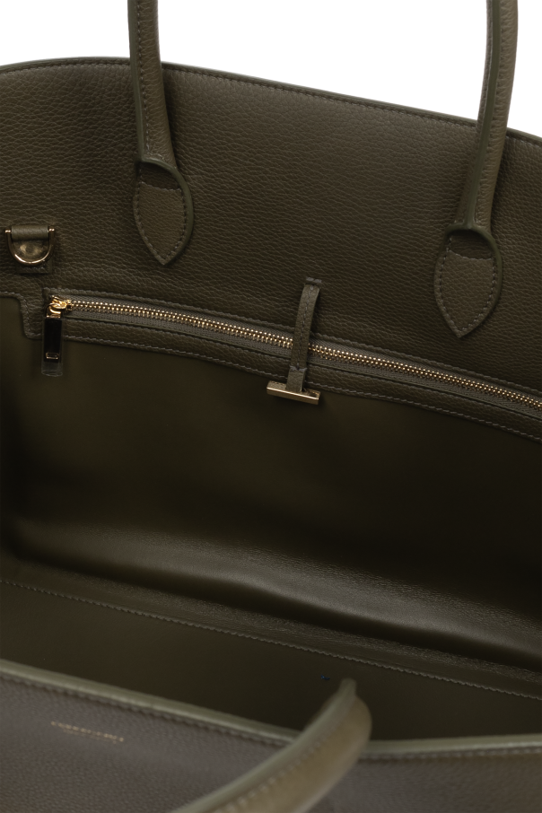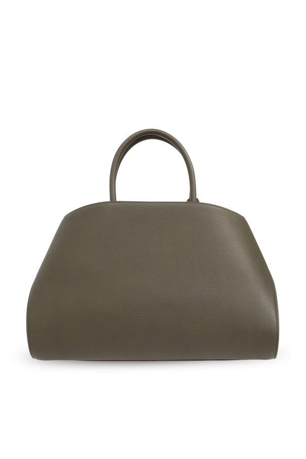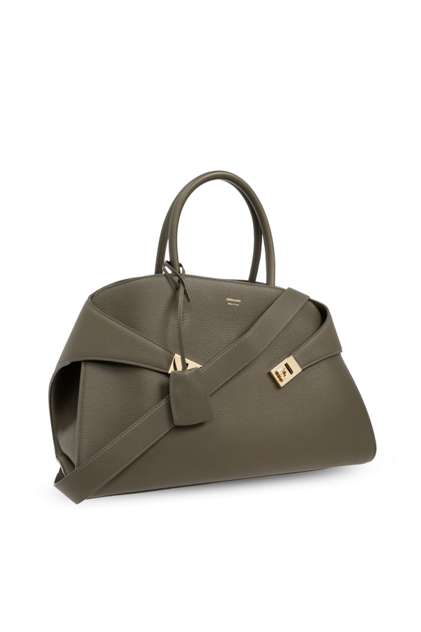 Introducing the Hug Medium Shoulder Bag from the esteemed house of Ferragamo. This exquisite bag epitomizes refined elegance and contemporary sophistication. Meticulously crafted from the finest natural calfskin leather, the bag boasts a gentle, grainy texture that enhances its luxurious appeal. The serene khaki green hue delivers a modern yet timeless aesthetic, perfect for any discerning fashion connoisseur. The Hug Medium features a classic shape with soft, rounded edges, providing a balanced blend of style and functionality. Designed for versatility, it can be carried by its dual hand straps or worn comfortably over the shoulder with its wide leather strap. Adorned with gold-toned hardware, including a chic clasp closure and an elegant \"Ferragamo Made in Italy\" inscription, this bag exudes opulence. Inside, you\'ll find a spacious compartment and a secure zippered pocket, ensuring your essentials remain organized and easily accessible. Why Choose This Product? Exquisite craftsmanship from a world-renowned designer. High-quality, grainy calfskin leather for a luxurious feel. Elegant khaki green color for a sophisticated look. Versatile carrying options with hand straps and a shoulder strap. Spacious interior with additional zippered pocket for organization.