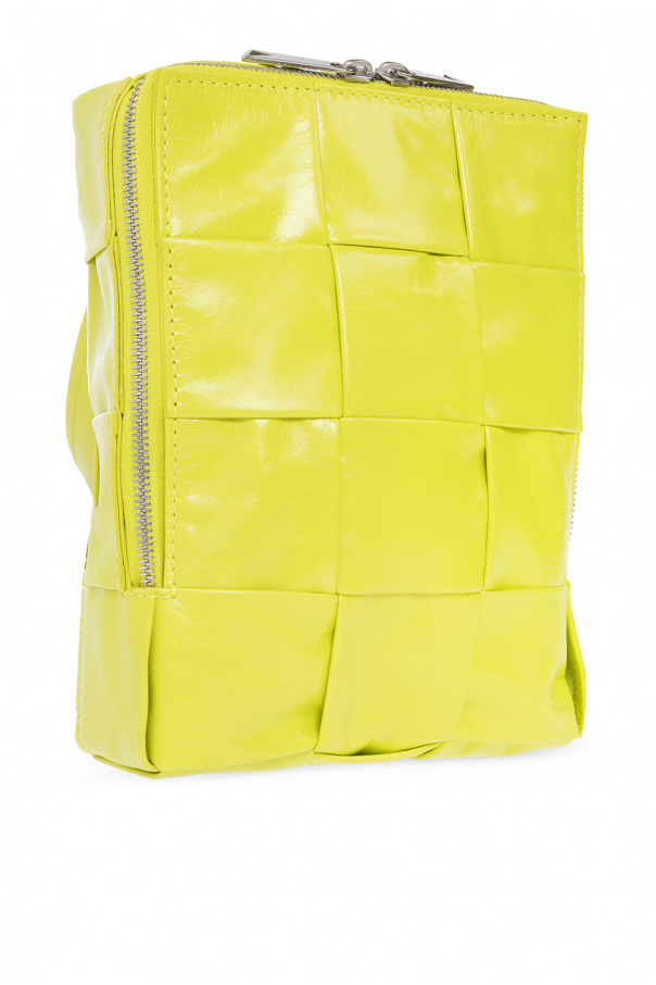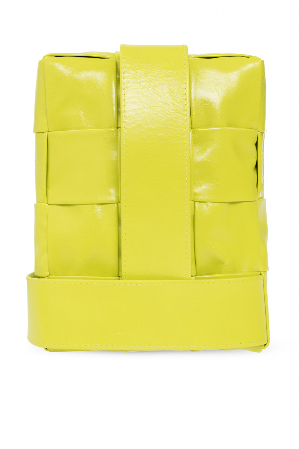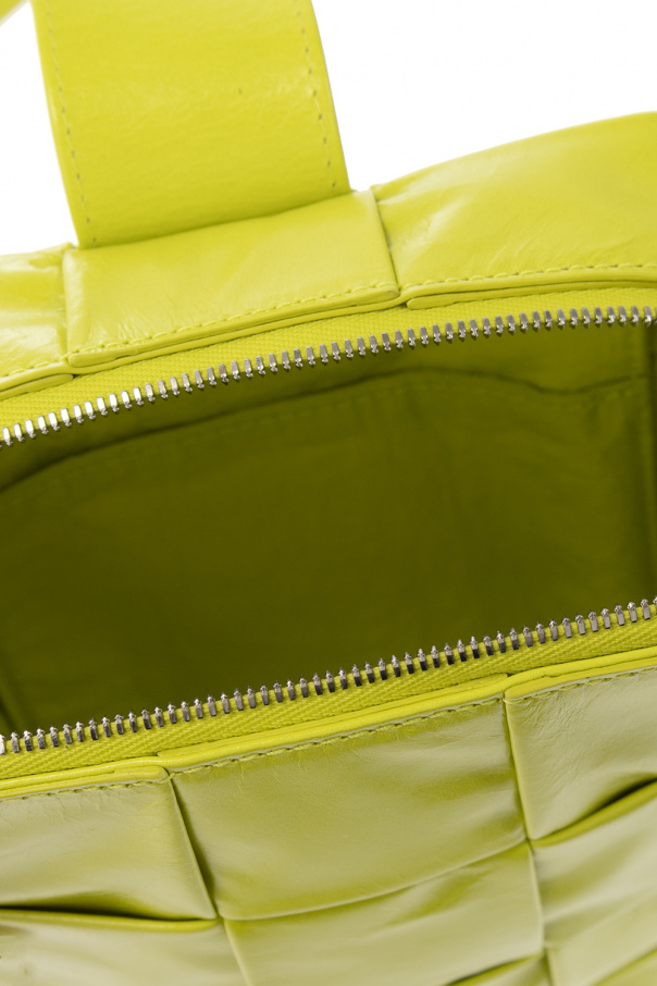 Green ‘Casette Mini’ shoulder bag from Bottega Veneta. Crafted from calf leather, this model features a two-way zip, the label’s signature Intreccio weave, adjustable shoulder strap, silver-tone metal hardware and one internal compartment with one slip pocket.