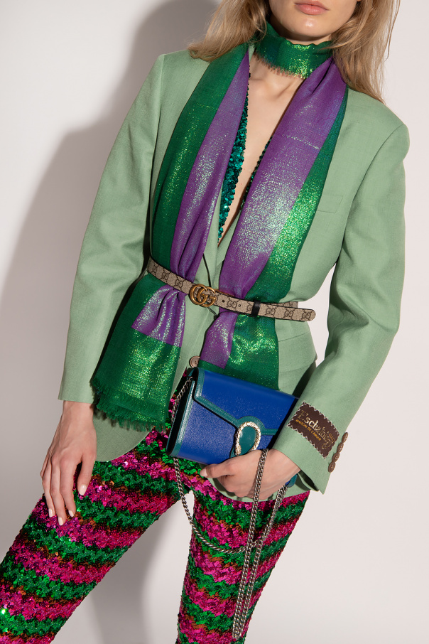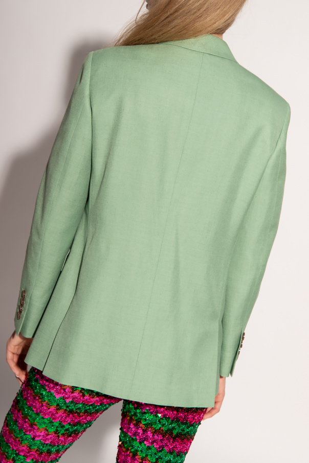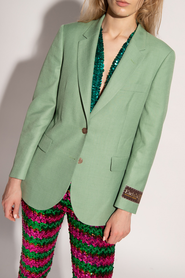 Green blazer with notch lapels from Gucci. Fastened with buttons, this garment is complete with two flap pockets, one slip pocket, double rear vent and long sleeves with a logo appliqué.