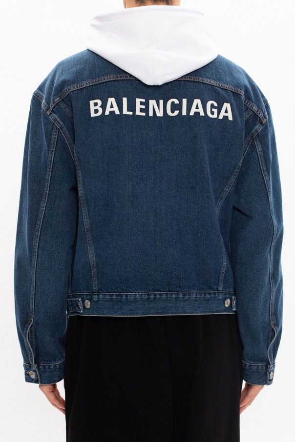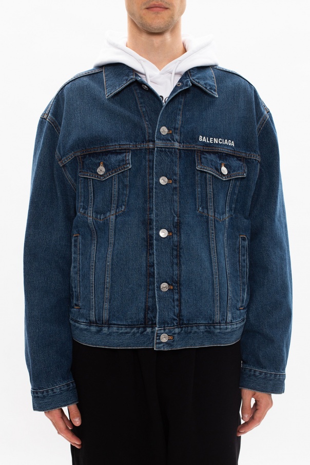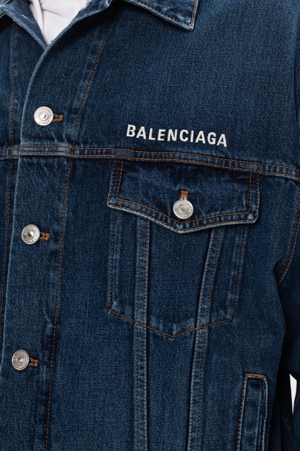 Dark blue denim jacket from Balenciaga. Featuring contrasting orange stitching details and white logo embroideries, this cotton-crafted style is complete with button closing, two slip side pockets and two button-fastened flapped chest pockets.