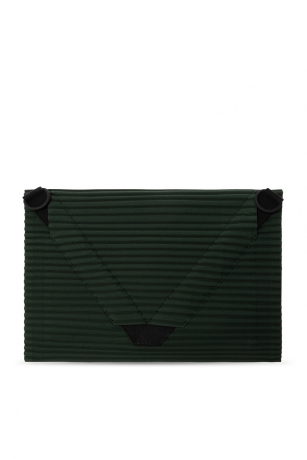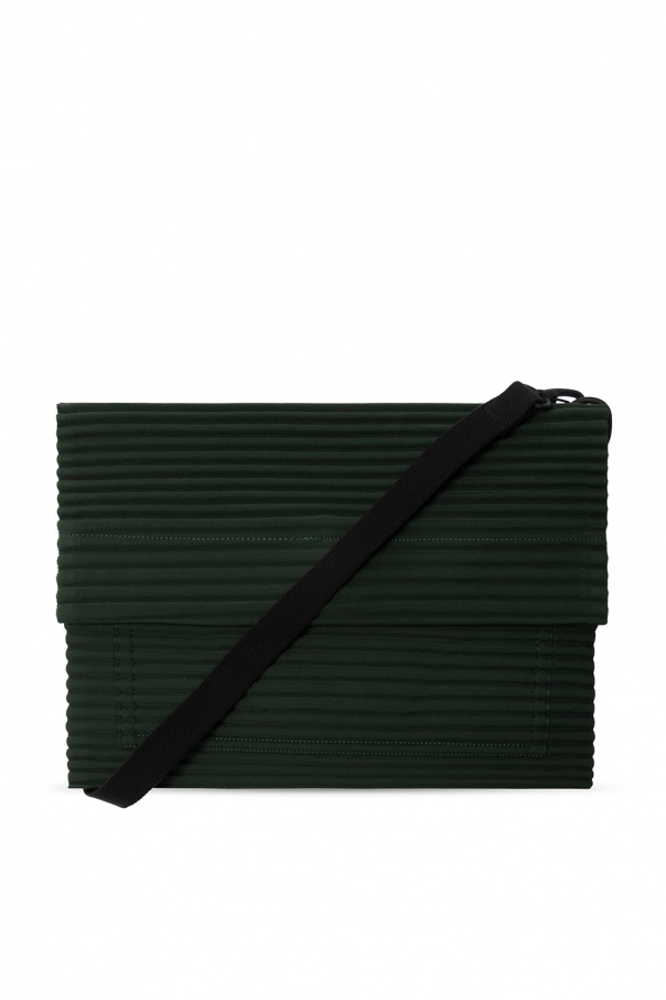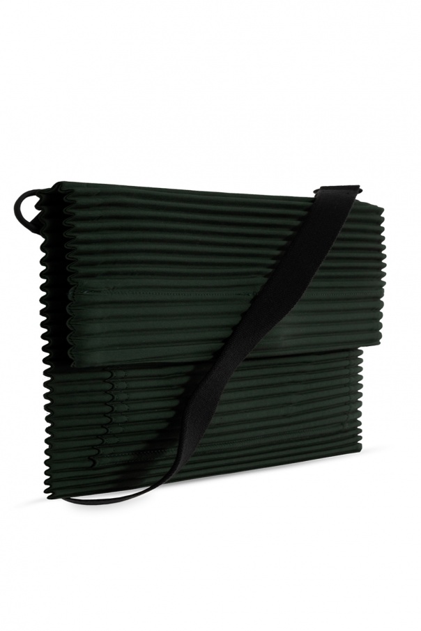 Green pleated shoulder bag from Issey Miyake Homme Plissé. Fastened with a snap, this style features a main internal compartment and removable shoulder strap.