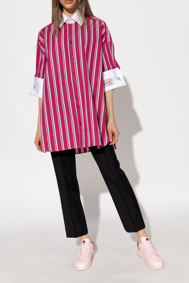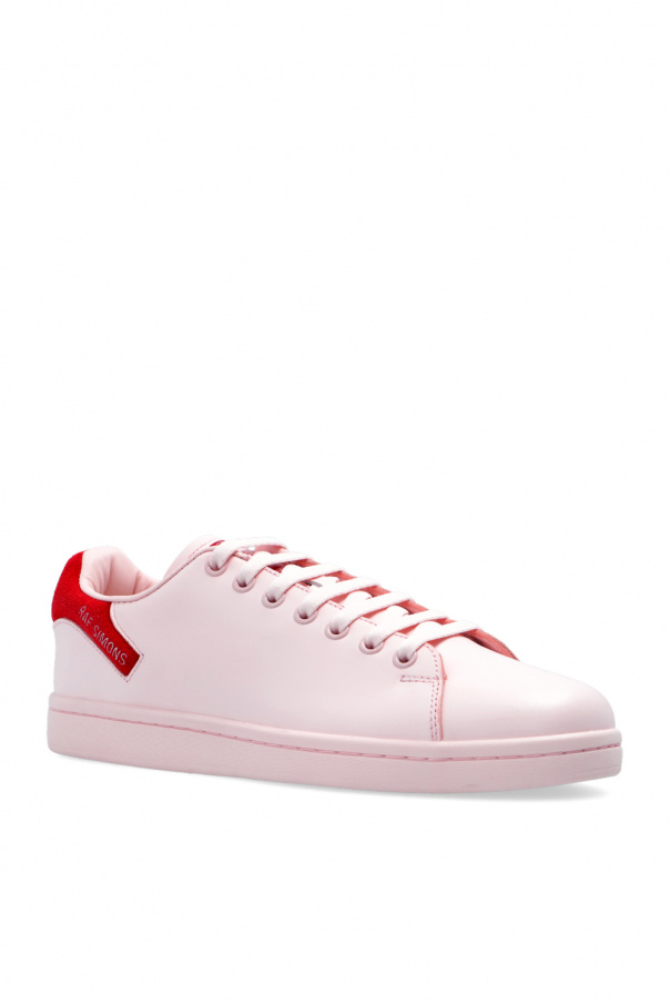 Pink ‘Orion’ sneakers from Raf Simons. Crafted from leather, this lace-up pair features a red textured insert with a silver-tone logo print and pink rubber sole.
