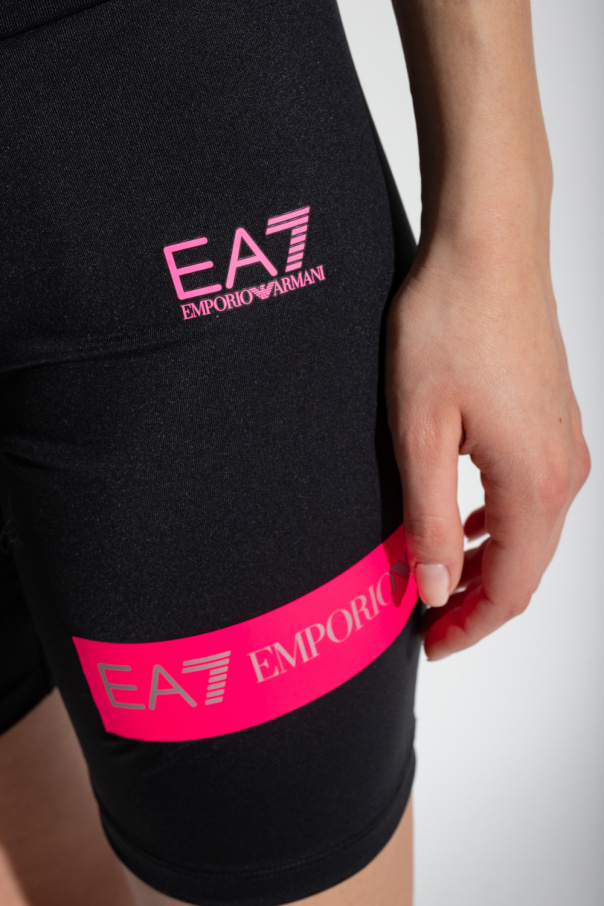 Black leggings from EA7 Emporio Armani. Cut with a cropped fit, they feature a pink logo print and a back zip closure.