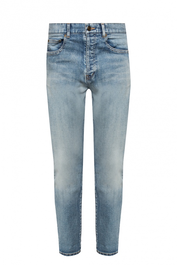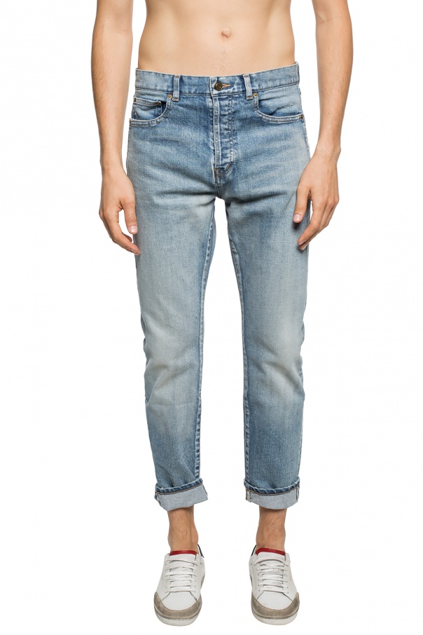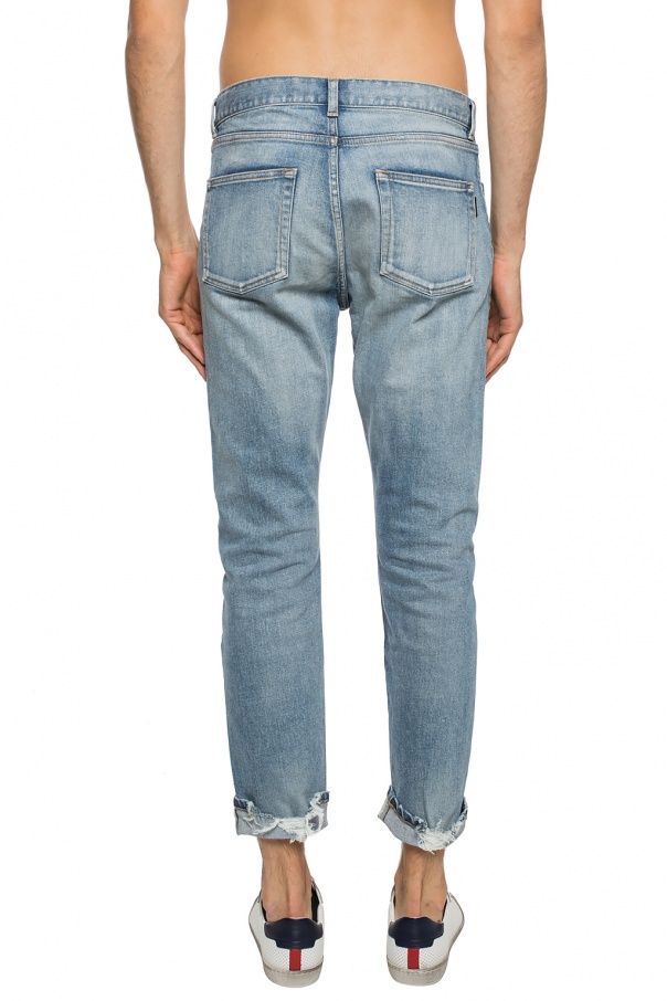 Light blue distressed jeans with a raw trim from Saint Laurent. Fastened with buttons. Two slip pockets on the front, two at the back. Tapered legs.