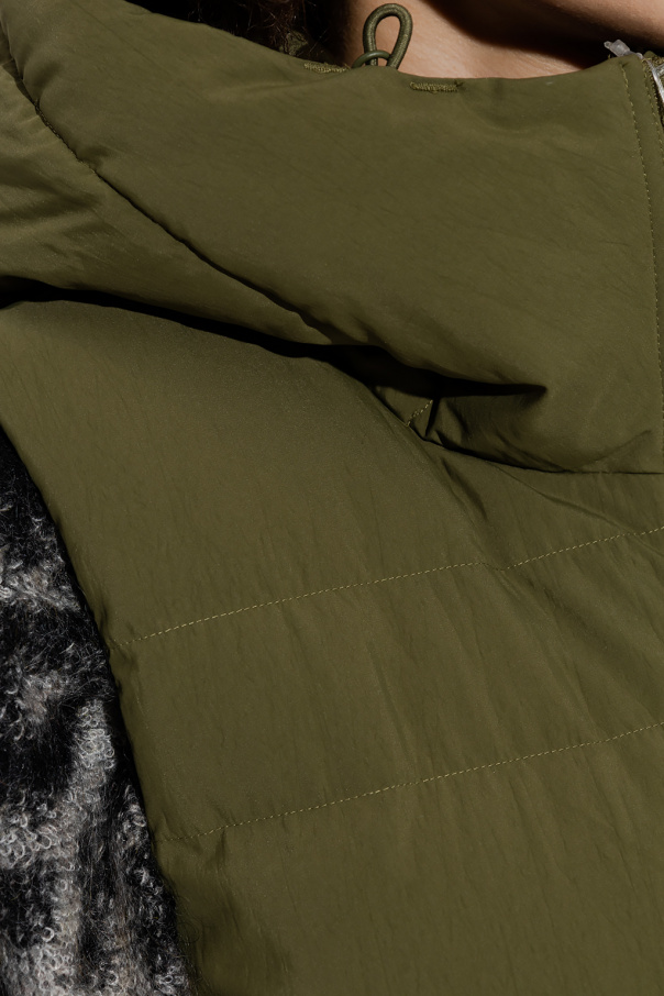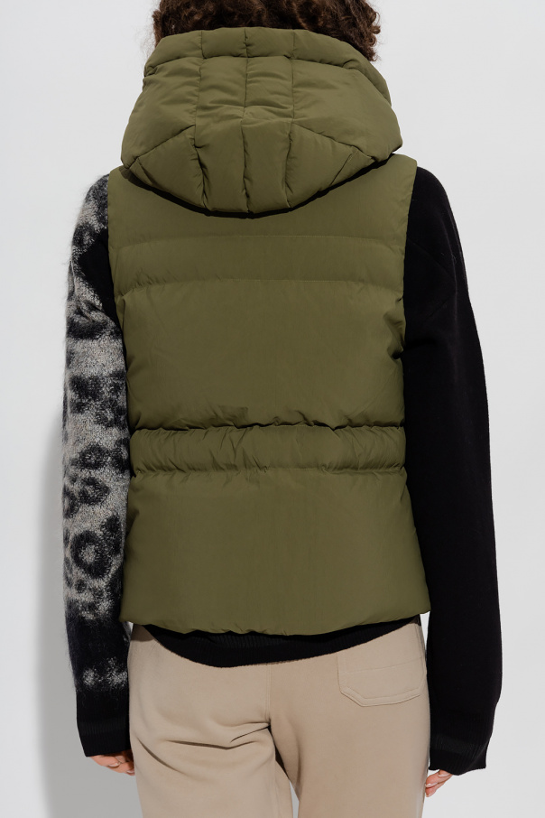 Green down vest from Y-3 Yohji Yamamoto. Fastened with a two-way zip, this design features two pockets, logo print at the back and drawstrings at the hem and hood.