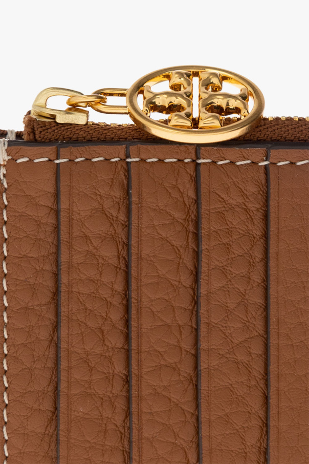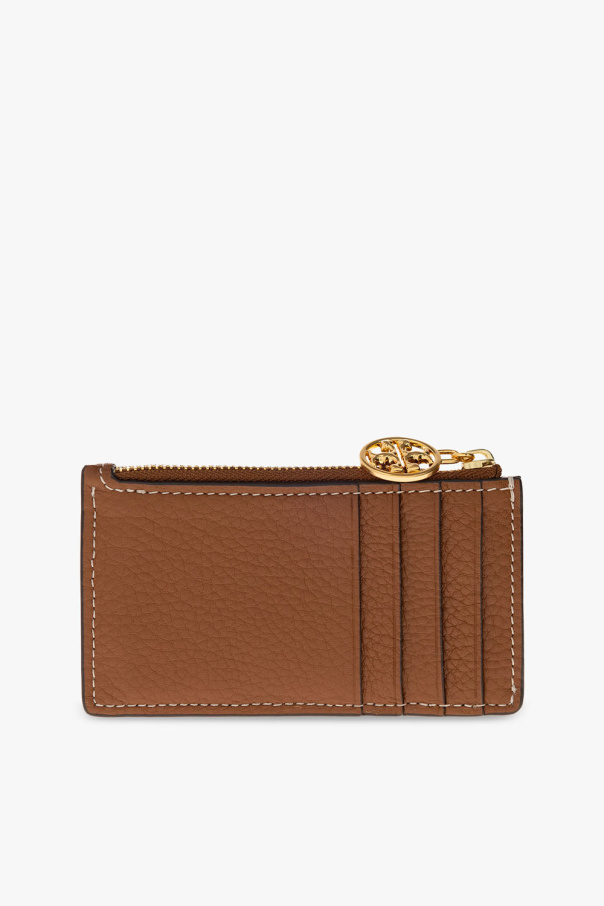 Brown ’Miller’ card holder from Tory Burch. Crafted from leather, this item features a zip pocket with a logo appliqué, eight card slots and gold-tone metal hardware.