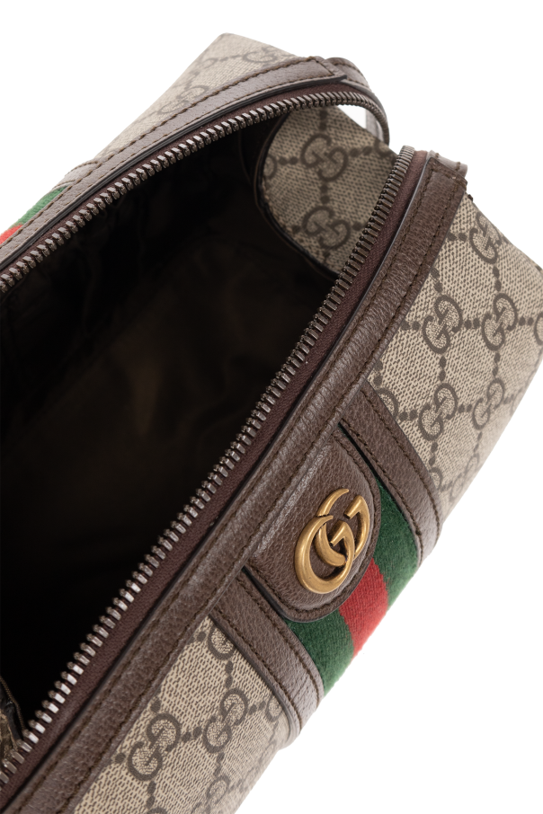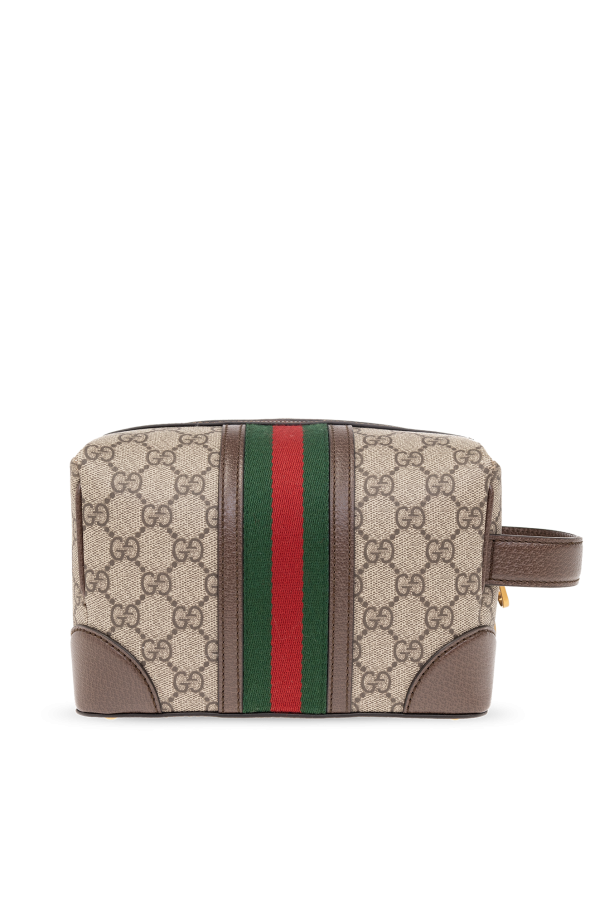 Beige and brown wash bag from Gucci. Crafted from ‘GG Supreme’ canvas and trimmed with calf leather, this design fastens with a two-way zipper that is secured with snaps on the sides and showcases ‘Double G’ hardware and green and red Web stripe detailing. It is complete with a short strap on the side, antiqued gold-tone metal elements and one internal compartment with two slip pockets.