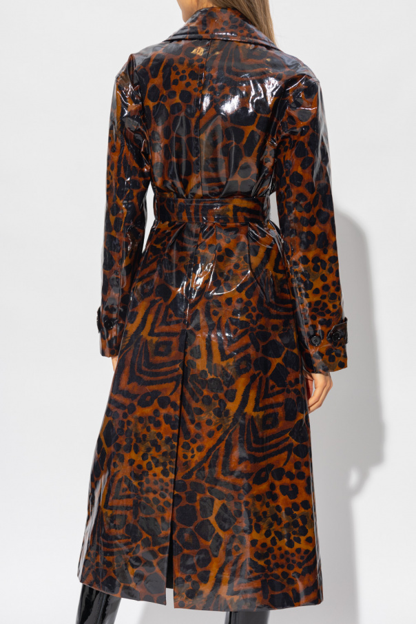 Brown and black vinyl coat from Dries Van Noten. Embellished with an animal motif, this style features a double-breasted button fastening, notch lapels, two slip pockets, a waist-cinching buckle belt, two slip pockets and long sleeves with button cuffs.