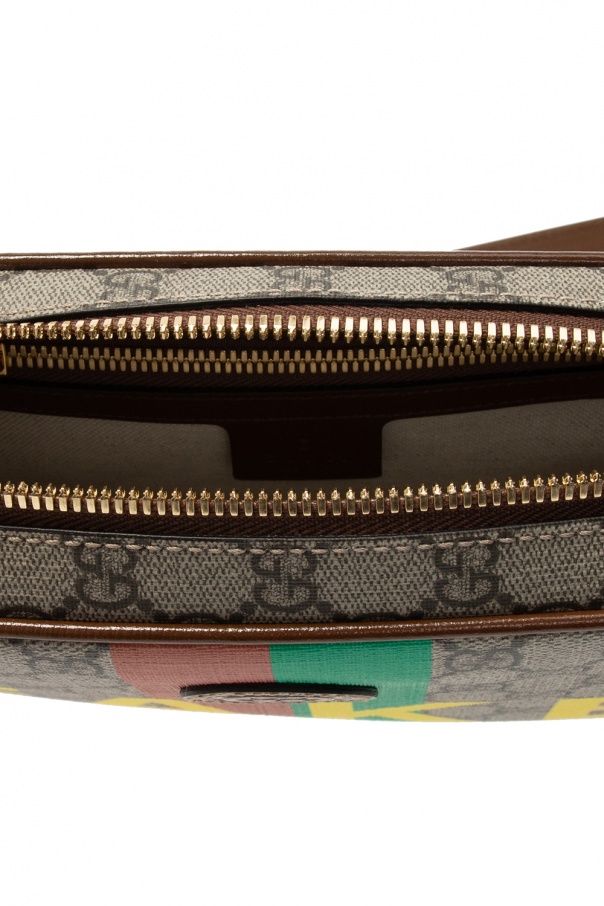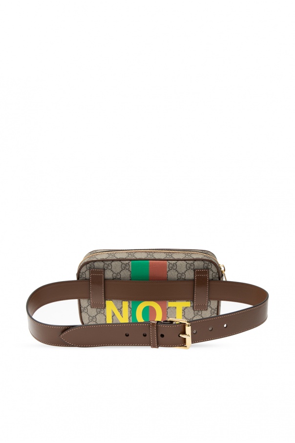 Brown and beige belt bag from Gucci. Crafted from GG Supreme canvas with leather trims, this design showcases printed yellow lettering and green and red Web stripe, zip fastening, and adjustable strap, gold-tone metal hardware and interior with one compartment, one zip pocket and one slip pocket.