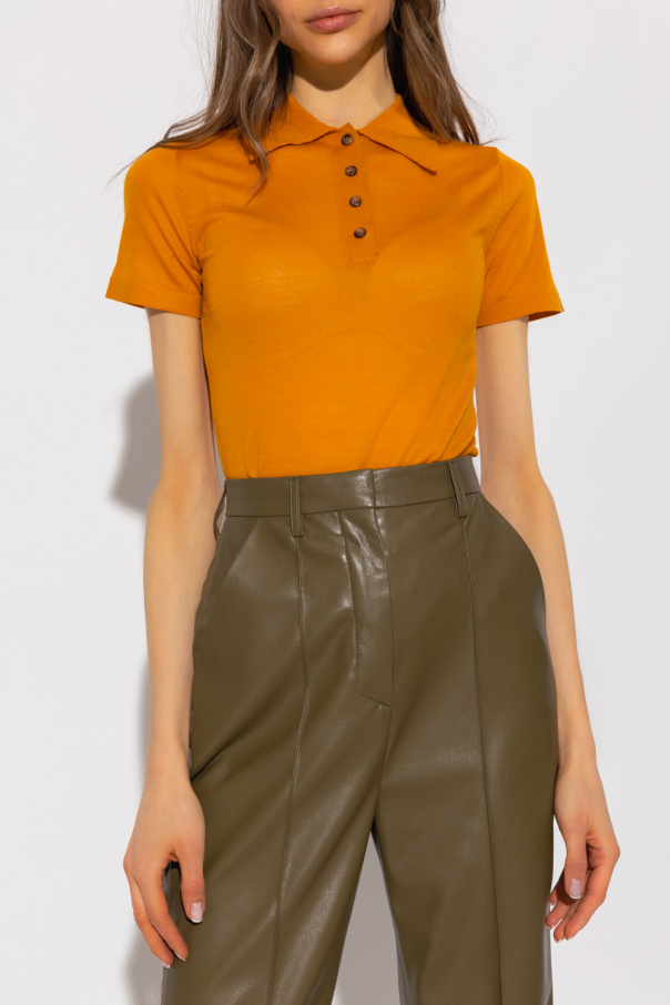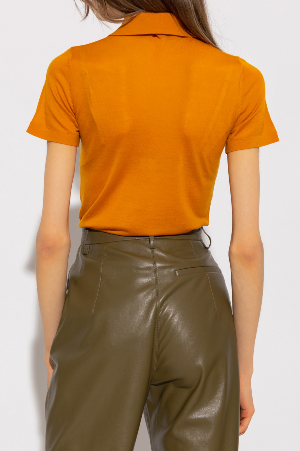 Orange ‘Hatti’ polo shirt from Nanushka. Made of wool, this short sleeve design features a buttoned collar and logo embroidery.