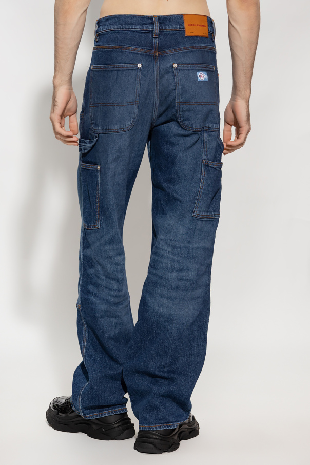 Dark blue jeans from Heron Preston. Fastened with buttons, this straight leg pair features logo patches at the back and multiple pockets.